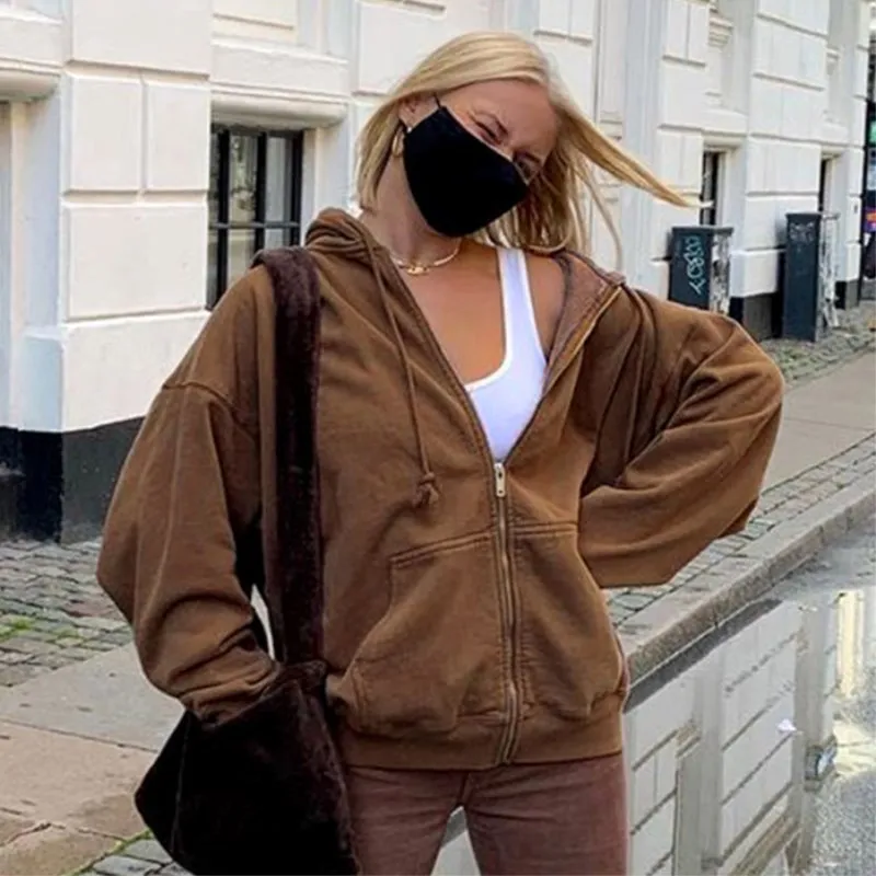 Коричневые худи Y2K, Женская винтажная толстовка на молнии, зимняя ...