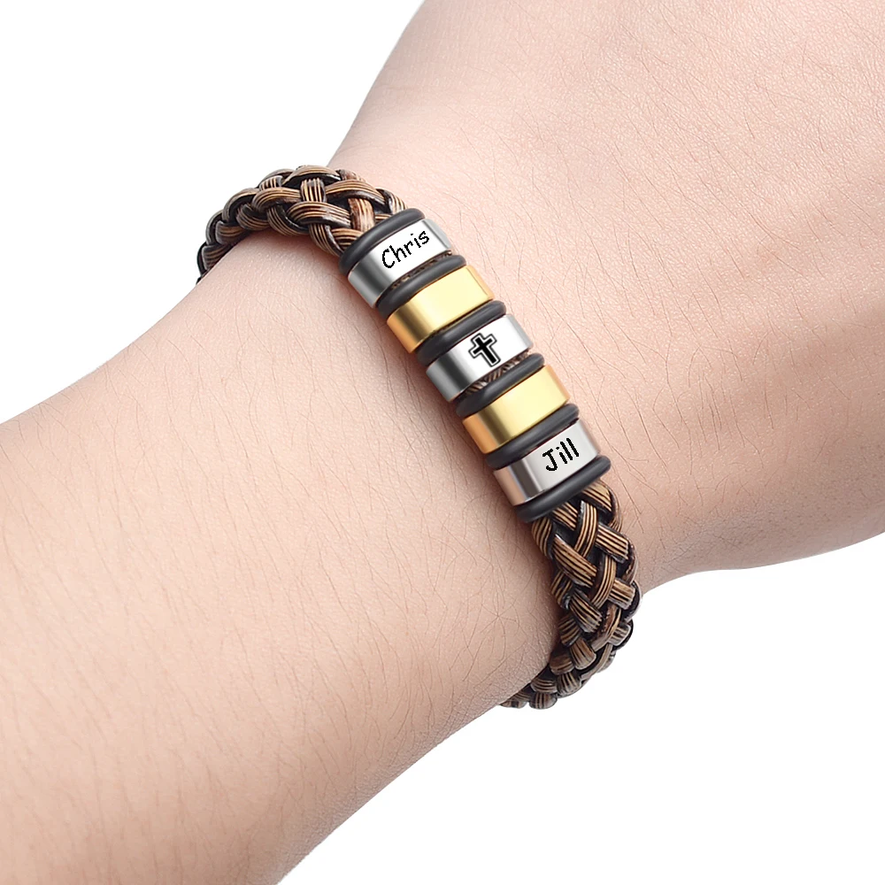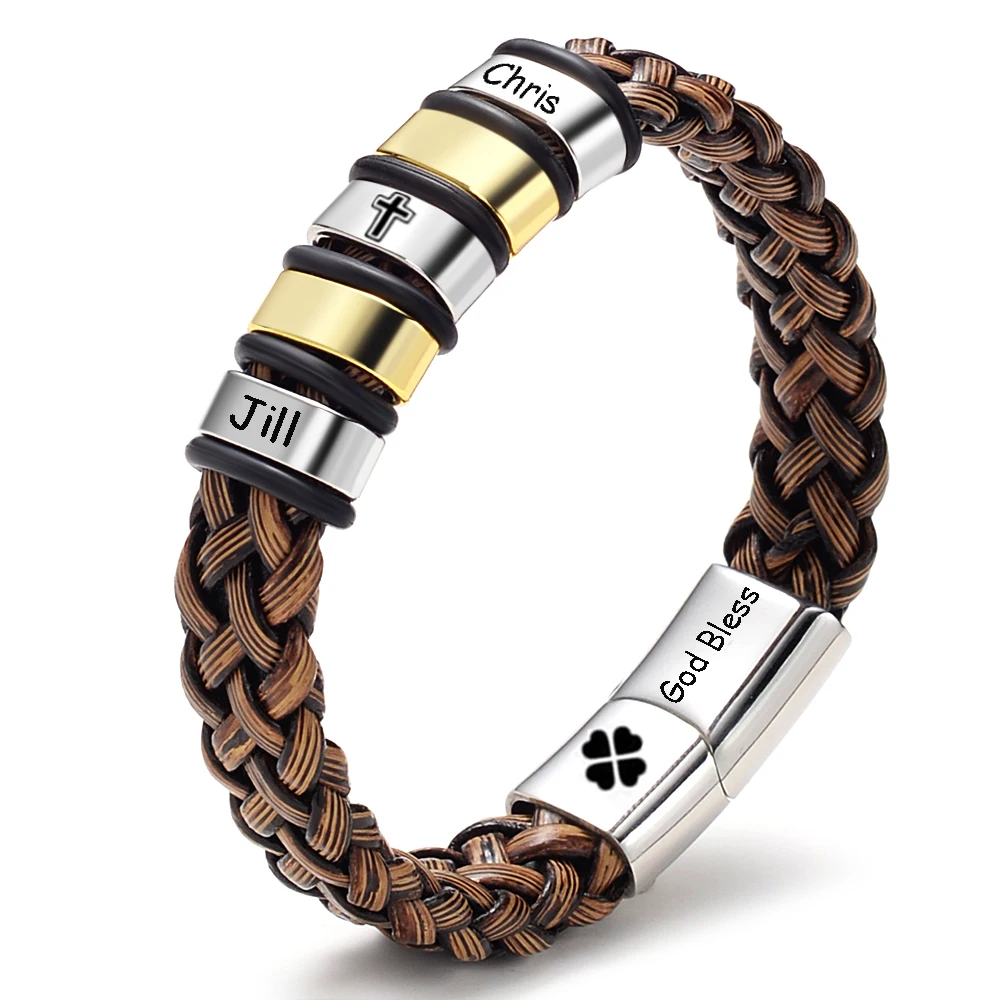 Материал: кожаный шнур, бусины из нержавеющей стали и застежкаПосылка: 1 мужской браслет на заказПоддержка местного языка: Имя, символы, буквы, фразы и т. Д.Примечание: Если нет вашего сообщения или заметки, мы вышлем вамПустой одинДо истечения срока доставки.