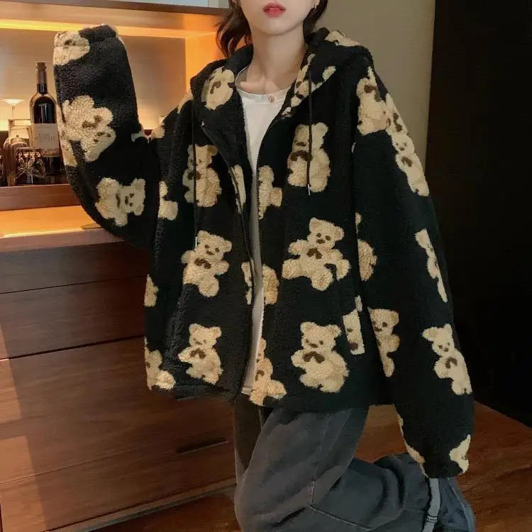 Женская толстовка с капюшоном и мультяшным медведем из овечьей шерс...