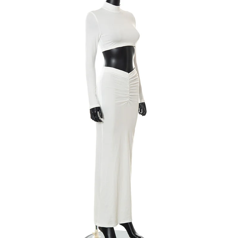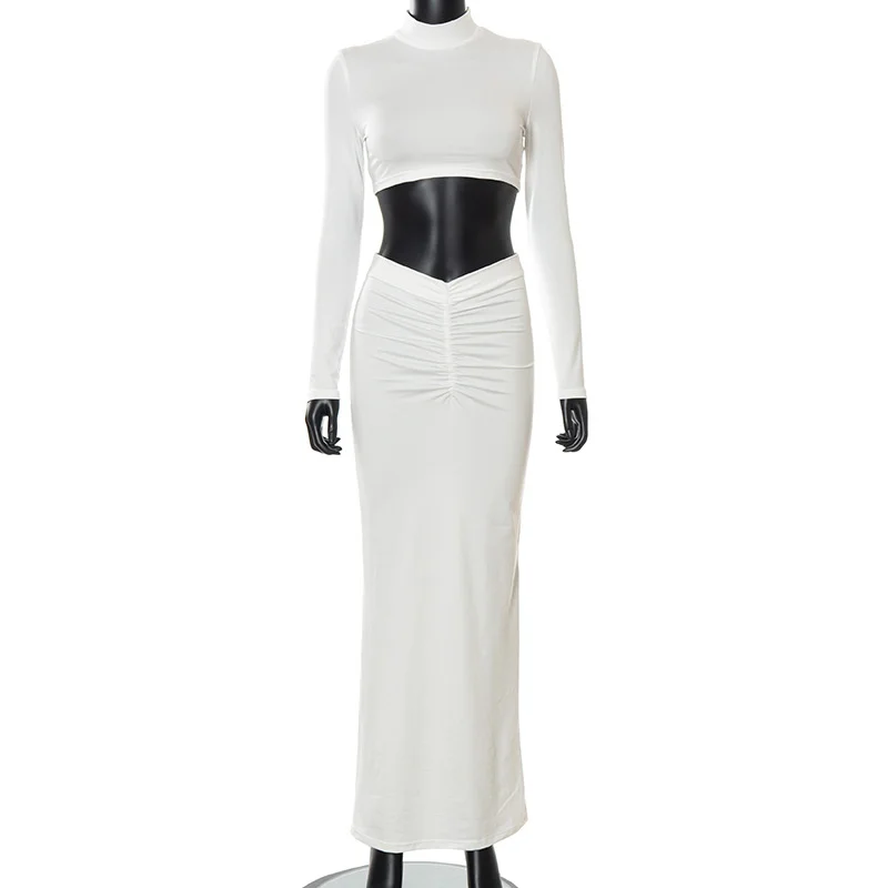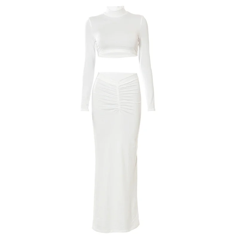 Женский костюм Zoctuo из двух предметов, белый укороченный топ с длинным рукавом и высоким воротником и юбка миди с рюшами, элегантная уличная одежда для вечерние