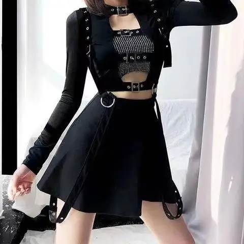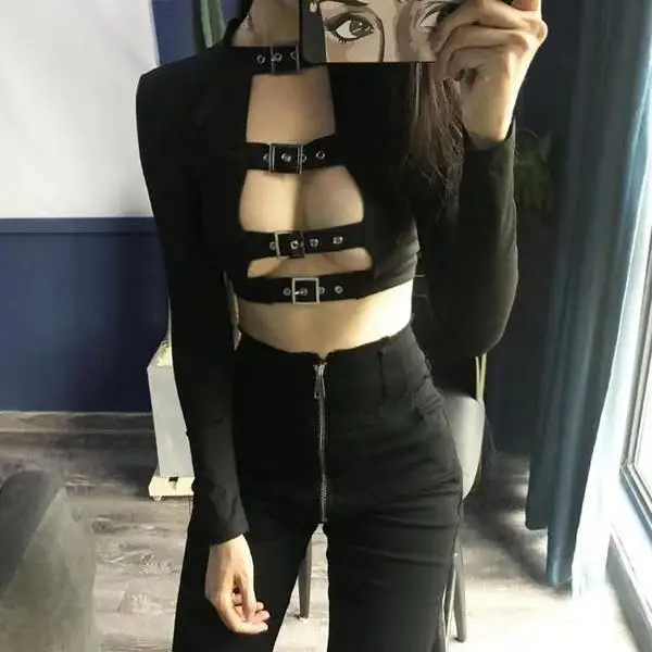 Женский топ с длинным рукавом Y2K, готический пикантный укороченный топ в стиле панк с вырезами и пряжкой, черные топы, уличная одежда для вечерние НКИ, женская футболка