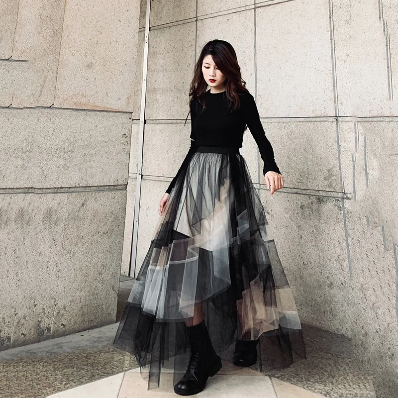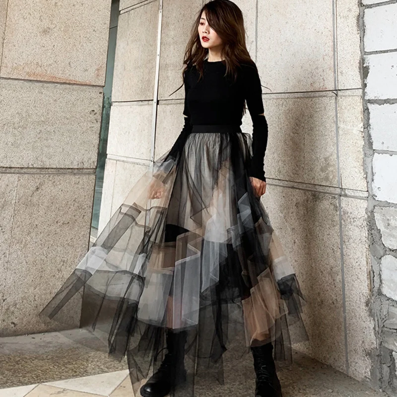 LANMREM Женская сетчатая юбка 2022 весна осень высокая талия юбки женские контрастные цвета длинная модная уличная одежда 2C2203