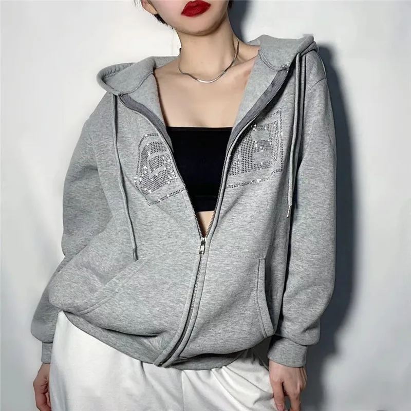 Y2K модные толстовки в стиле Харадзюку стразы на молнии с капюшоном...