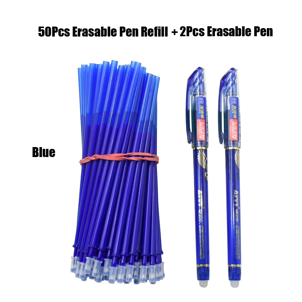 -Название: набор стираемых гелевых ручек-Диаметр пишушей головки: 0,5 мм-Размер пера: стержень со стираемыми чернилами 13 см/стираемая ручка 14,5 см-Количество: 50 шт. стираемая ручка + 2 шт. стираемая ручка-Цвет чернил: синий/черный на выбор-Материал: пластик-Прямая доставка: Поддержка-Гладкое письмо, без сухих пятен-100% новый и высокое качество-Примечание покупателя: из-за стираемости, он не может быть использован для подписания ценных бумаг и важных документов.