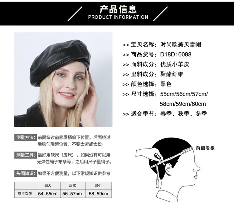 Название продукта:Женский берет, Черный берет из натуральной кожи, шапка для женщин, весна-осень, плоская шапка Gorras, женская шапка из овчины