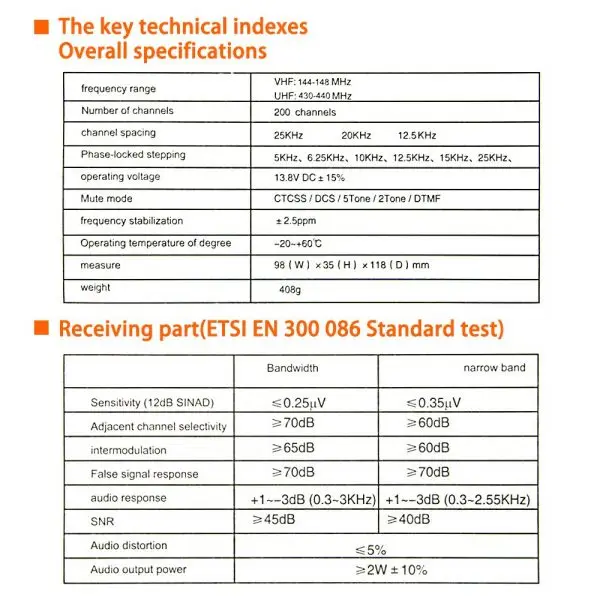 Широкополосный узкополосный Выходная мощность 25 Вт/20 Вт (VHF/UHF) Системы 16KΦF3E 11KΦF3E Прилегающий канал ≥ 70 дБ ≥ 60 дБ Мощность Отношение сигнал-шум ≥ 40 дБ ≥ 36 дБ Паразитический и ≥ 60 дБ ≥ 60 дБ Гармонические волны Аудио ответ + 1 ~-3db (0,3 ~ 3 кГц) + 1 ~ 3db (0,3 ~ 2,55 кГц) Искажение звука ≤ 5%