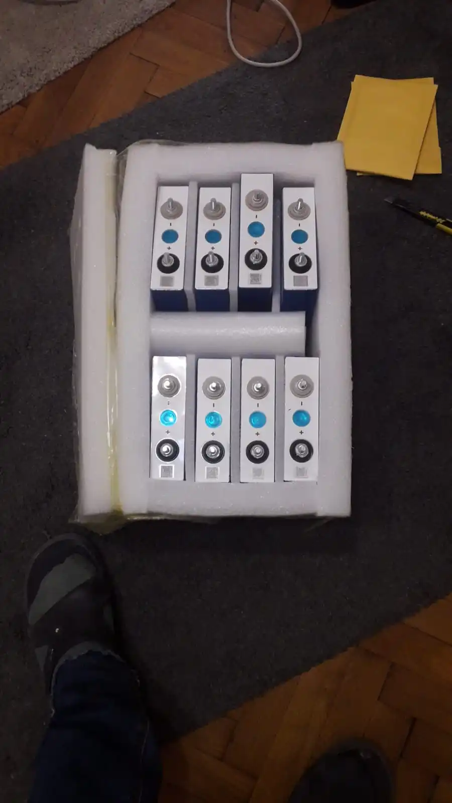 Получить bateries с некоторыми delaing, но он прибывает в хорошем состоянии. Есть некоторые изгибы в форме, но tope это не проблема. Все клетки 3,288-3,29 вольт и 0,5-0,7 МОМ ИК. Надеюсь, что перевернул потенциал, но будет проверить его позже.