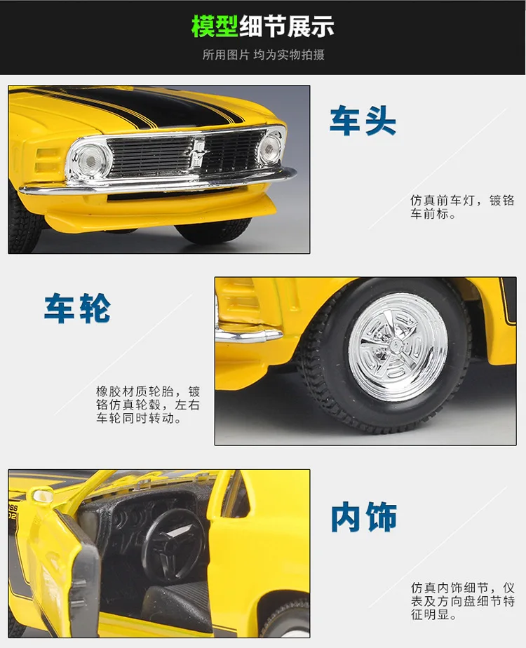 Название: 1970 Ford Mustang Boss 302Бренд: MaistoРазмеры: около 20cmX7.5cmX5.6cmМасштаб: 1:24Материал: корпус из литого металла с пластиковыми деталямиФункция:● Открывающийся капюшон и дверь● Вращение без четырех колес