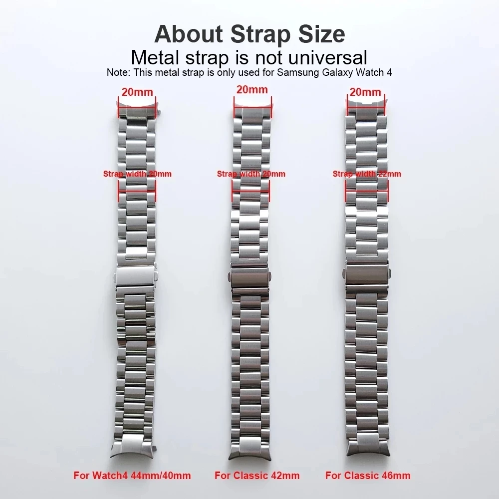 Ремешок из нержавеющей стали без зазоров для Samsung Galaxy Watch 4 Classic 46 мм 42 мм Watch4 40 мм 44 мм ремешок на запястье изогнутый конец металлический браслет <;br/>-о выборе размера ремешка: металлический ремешок не является универсальным, пожалуйста, выберите подходящую модель часов для покупки (Совместимость 44 мм и 40 мм)<;br/>-о монтаже ремешка: Есть паз на одном конце ремешка, этот конец соответствует датчику атмосферного давления часов <;br/> Длина ремешка: 185 мм (длина может быть сокращена с помощью инструмента)<;br/> Вес ремешка:<;br/> для Galaxy Watch 4 classic 46 мм: вес 95 г <;br/> для Galaxy Watch 4 classic 42 мм: вес 90 г <;br/> для Galaxy Watch 4 44/40 мм: вес 90 г <;br/> Упаковка:<;br/>1 * ремешок (Часы в комплект не входят)<;br/>1 * Инструмент регулировки длины ремешка (бесплатный подарок не поддерживает послепродажное обслуживание)