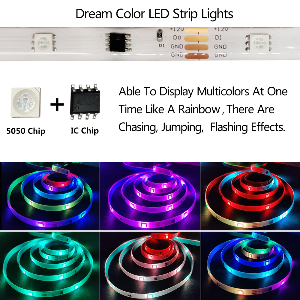 Особенности:1. Поддерживает управление через приложение bluetooth и инфракрасный пульт дистанционного управления.2. Встроенный микрофон с музыкальными и немузыкальными эффектами, множество параметров регулируется.3. С функцией автоматического сохранения параметров настройки.Длина светодиодной ленты: 5 м/10 мМетод контроллера:1. 38 кнопки, инфракрасный пульт дистанционного управления (без батареи).2. Bluetooth Smart APP.Адаптер питания: источник питания DC12V.Водонепроницаемость: IP20 не водонепроницаемый.● Светодиодная лента DreamColor: наши светодиодные музыкальные лампы используют передовые микросхемы IC, которые могут отображать несколько цветов одновременно, как радуга, есть чеканка, прыжки, мигающие эффекты. Более необычные и яркие, чем светодиодные лампы RGB.● Режимы изменения насыщенного цвета: поставляются с 18 режимами изменения цвета музыки и 142 режимами изменения цвета без музыки, которые являются яркими и красивыми. Он может автоматически менять цвета или следовать вашей команде в режиме non-music.● Статический цвет и яркость регулируются: если вы не хотите, чтобы музыкальный режим, настройте его на статический цвет, который используется для освещения, например, белый, красный, зеленый, синий и так далее. Можно регулировать яркость каждого цвета.● Многократное использование:1. Используется для украшения автомобильного и велосипедного, пограничного или контурного освещения.2. Широко используется для украшения дома, отелей, клубов, торговых центров.3. Архитектурное декоративное освещение, изысканное атмосферное освещение.4. Широко применяется при заднем освещении, скрытом освещении, освещении буквы канала.5. Аварийное и безопасное освещение, освещение рекламных знаков.6. Декоративные светильники для праздников, мероприятий, выставки.