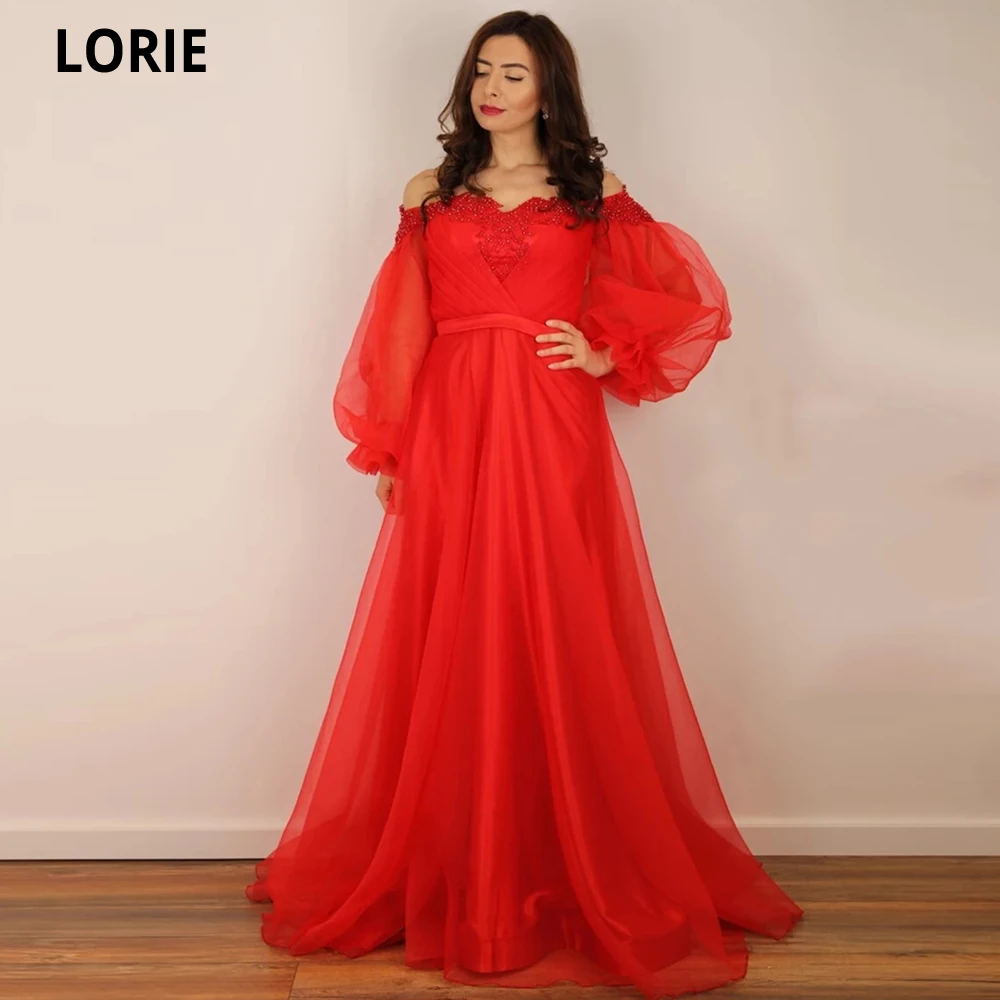 LORIE красные длинные платья с пышными рукавами для выпускного вечера 2021 модное ТРАПЕЦИЕВИДНОЕ ПЛАТЬЕ с аппликацией сердечком Вечерние платья из тюля