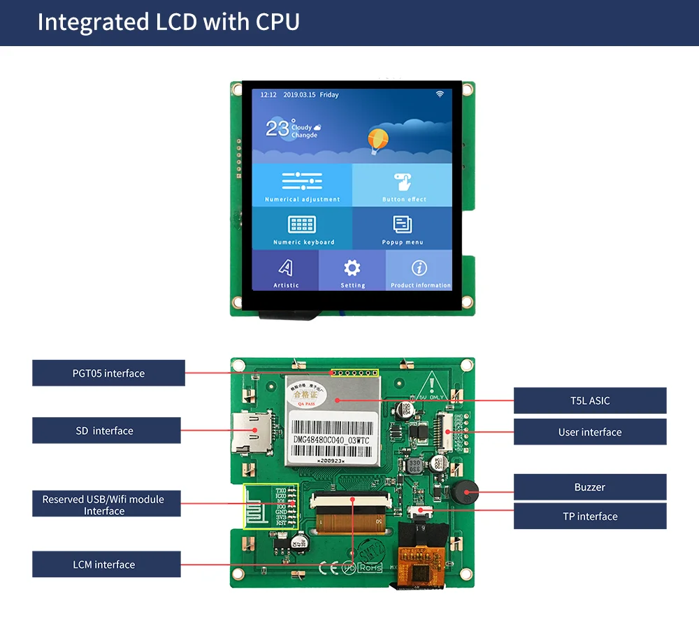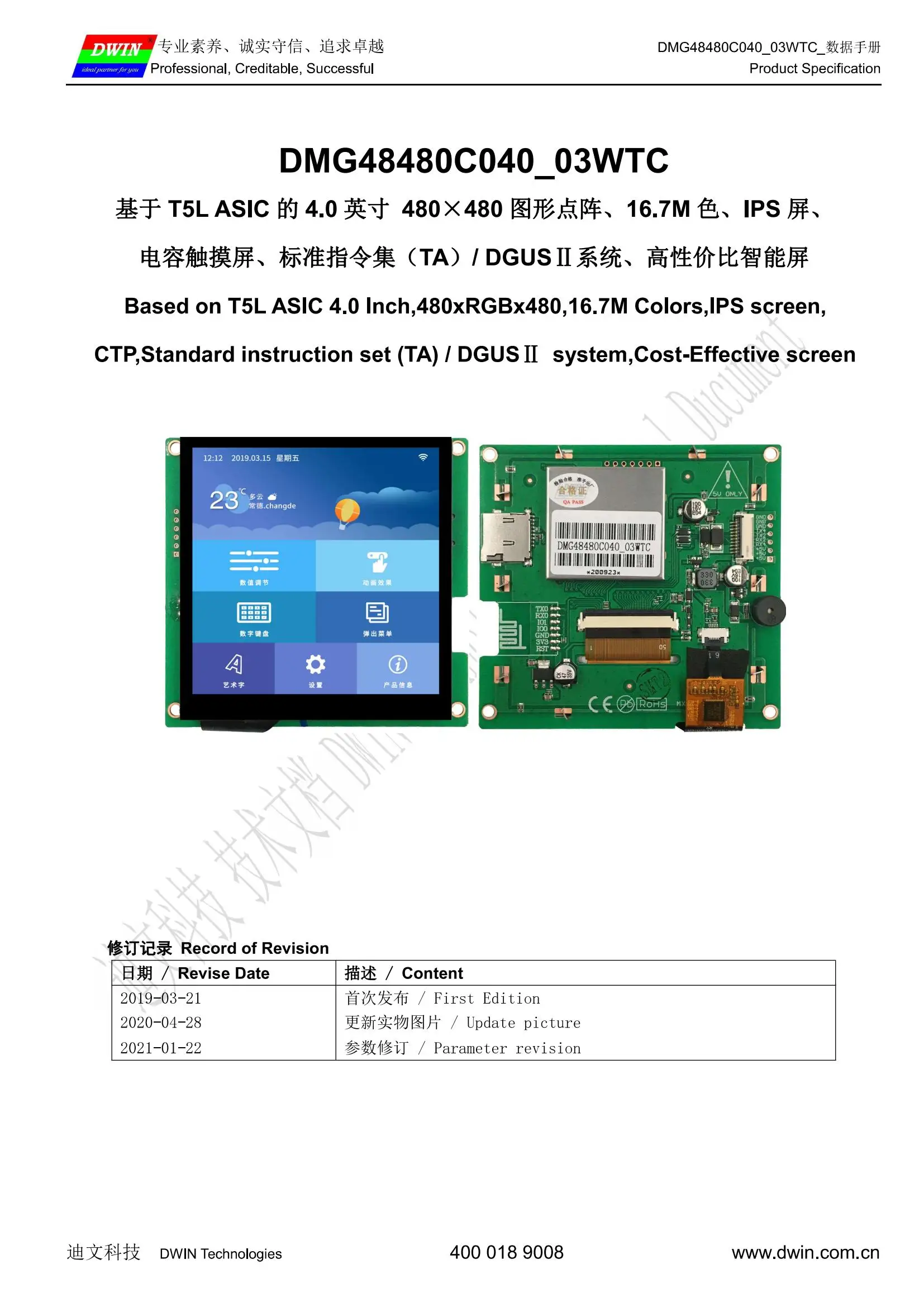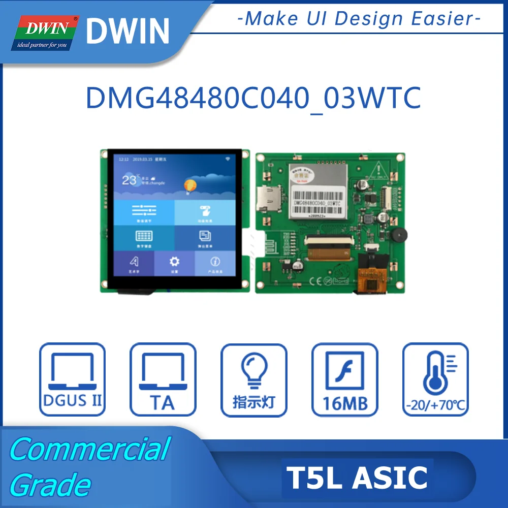 О DWINТехнология DWIN является ведущим мировым поставщиком высококачественных продуктов и решений для взаимодействия между человеком и машиной (HMI). Опираясь на лидирующие и конкурентные преимущества продукции с точки зрения функций, качества, услуг и цен, продукты и решения HMI DWIN Technology широко используются в таких отраслях, как умные приборы, новые энергетические, финансовые машины, инженерные машины, искусственный интеллект, экспортные механические и электрические продукты и медицинские, Красота и здоровье и т. Д.О продуктеИсходя из T5L 4,0 дюймов, 480*480,IPS TFT LCM, широкий угол обзора, Стандартный набор команд (TA)/DGUSII системы, экономически эффективным. DGUS и DWIN OS (вы можете гибко спроектировать интерфейс экрана, ОС DWIN используется для вторичной разработки экрана) работают на отдельных 8051 ядер. Цикл DGUS может быть таким же коротким, как 20 мс, и любая машина Чрезвычайно гладкая.