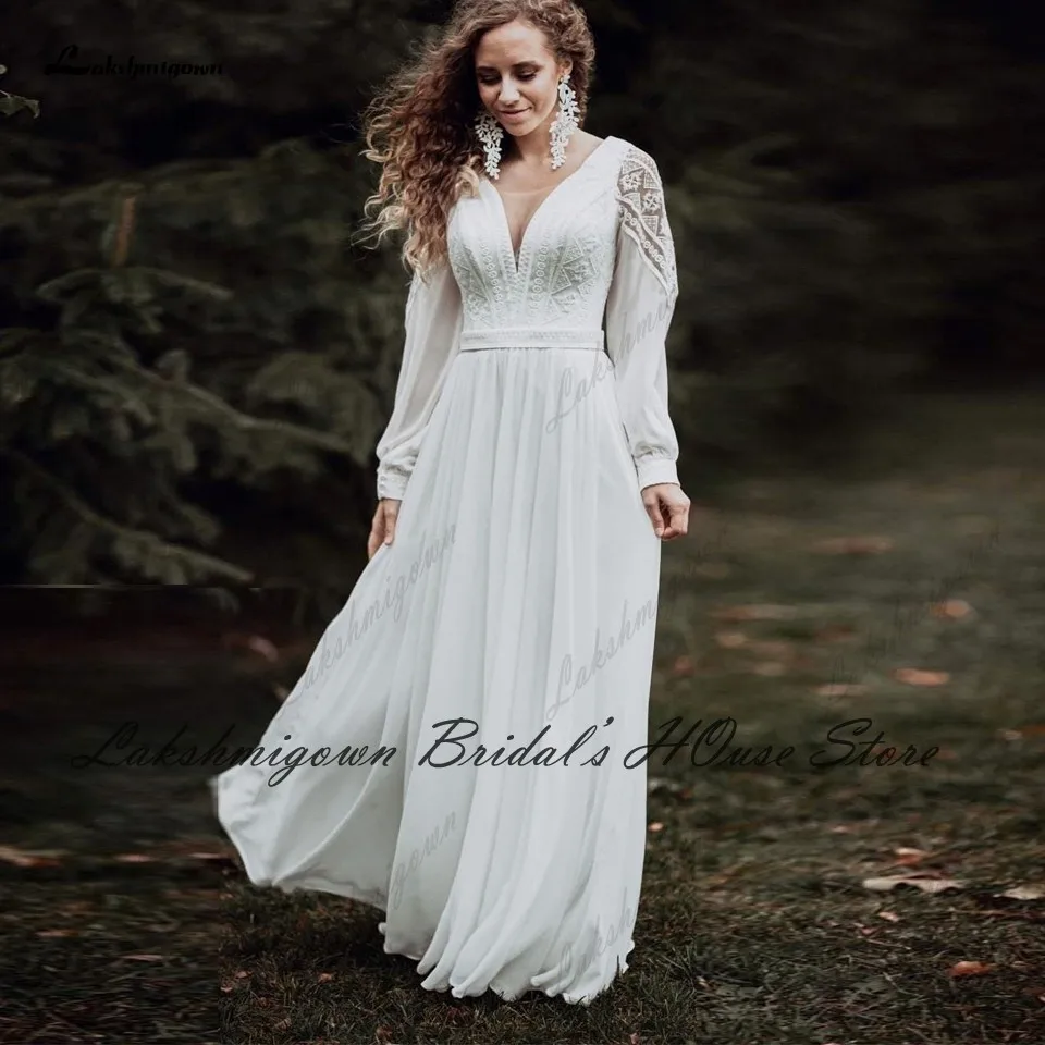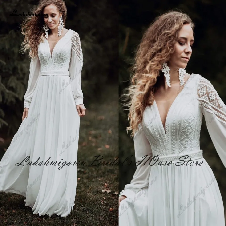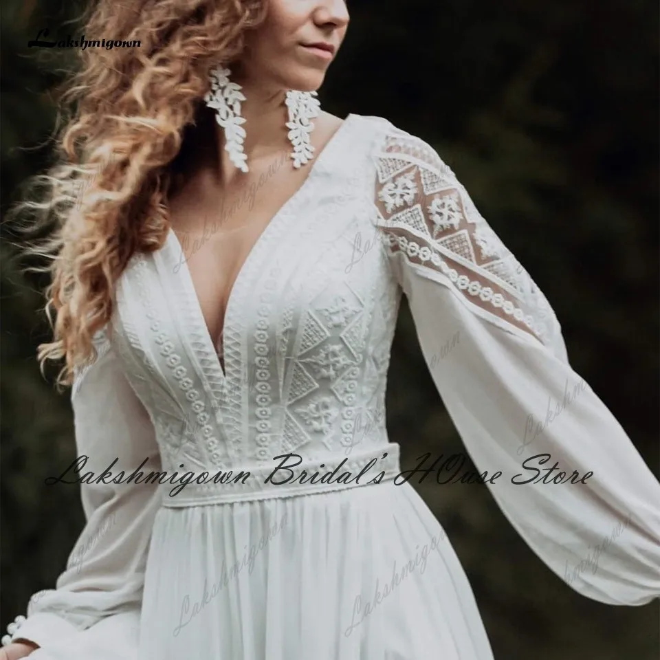 Lakshmigown пышное свадебное платье с длинным рукавом в стиле бохо, модель 2022 года, женское платье с V-образным вырезом, шифоновое свадебное платье трапециевидной формы, напольное платье