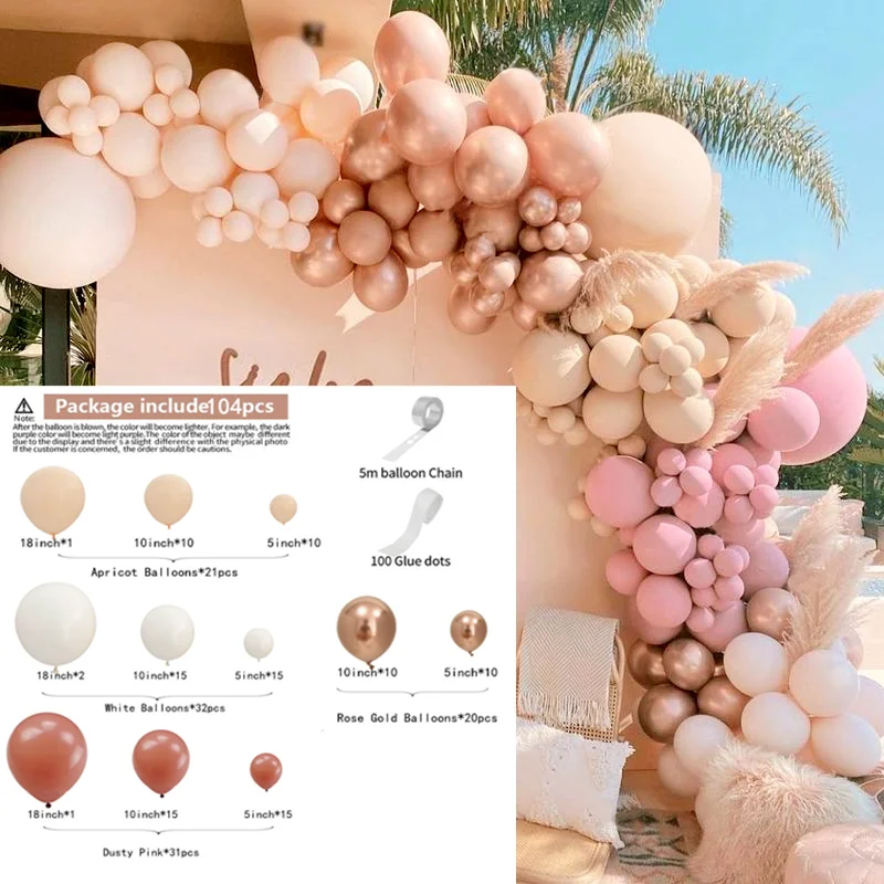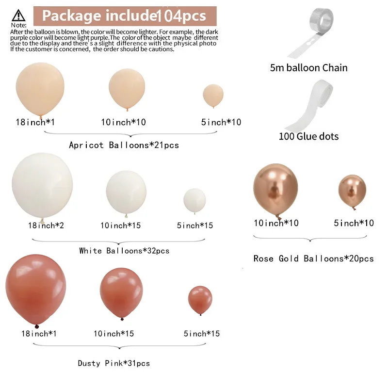 Пыльно-розовый (5 дюймов * 15 шт., 10 дюймов * 15 шт., 18 дюймов * 1 шт.)Белый (5 дюймов * 15 шт., 10 дюймов * 15 шт., 18 дюймов * 2 шт.)Абрикосовый (5 дюймов * 10 шт., 10 дюймов * 10 шт., 18 дюймов * 1 шт.)Хромовое розовое золото (5 дюймов * 10 шт., 10 дюймов * 10 шт.)Бесплатно: 1 рулонный клейЦепочка для воздушных шаров
