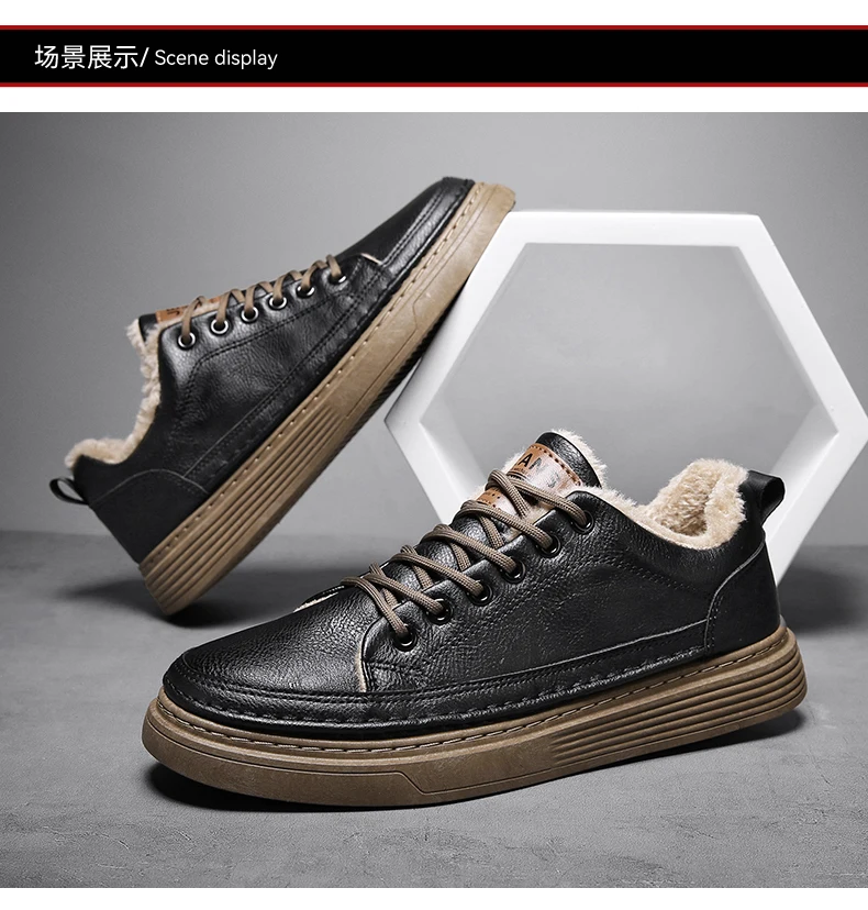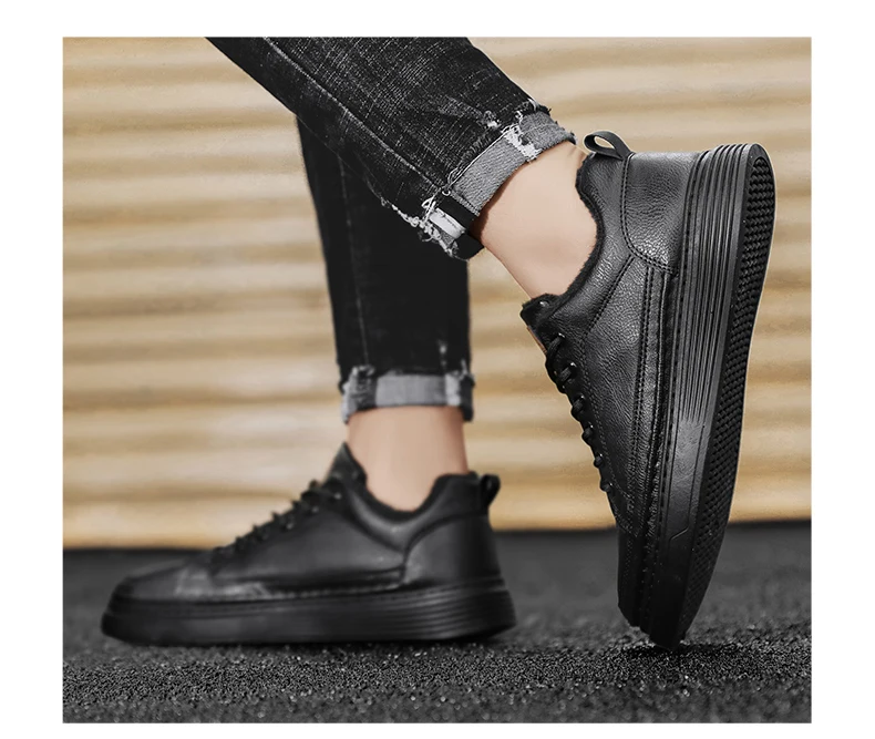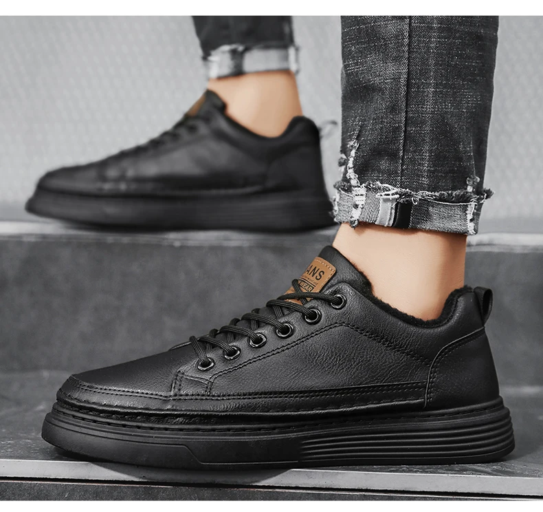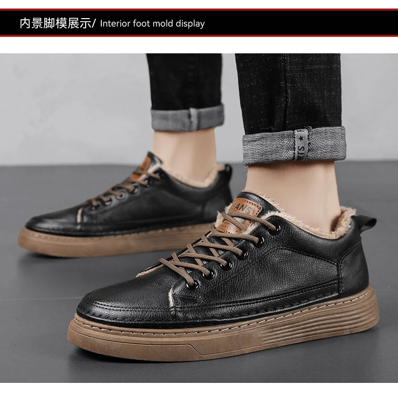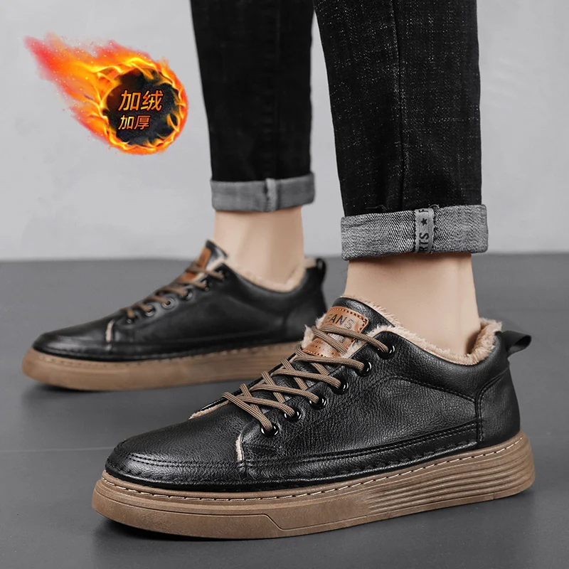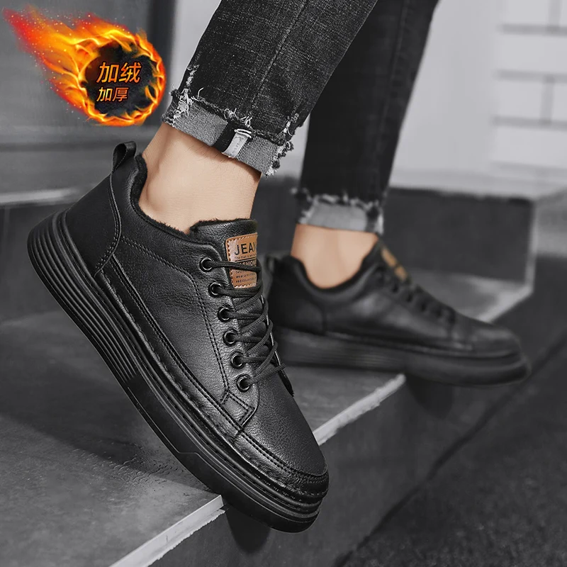 Мужские кожаные кроссовки, Повседневная Теплая обувь на плоской подошве, с бархатной подкладкой, Нескользящие, оригинальные дизайнерские, однотонные, из хлопка, для зимы