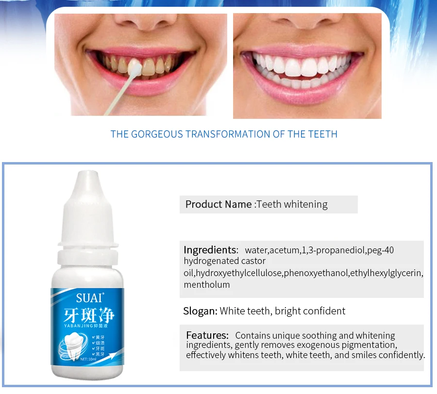 ▶Использование для отбеливания зубов эссенция: Перед использованием, пожалуйста, очистите рот теплой водой, затем Используйте ватный тампон, чтобы окунуть необходимое количество продукта, равномерно протрите поверхность зубов и протрите краску чистой водой через 15-20 минут, мы рекомендуем использовать 2-3 раза в неделю.