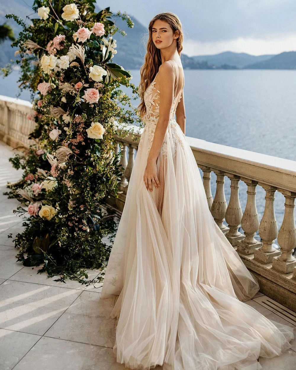 Платье свадебное кружевное ТРАПЕЦИЕВИДНОЕ с V-образным вырезом и поясом