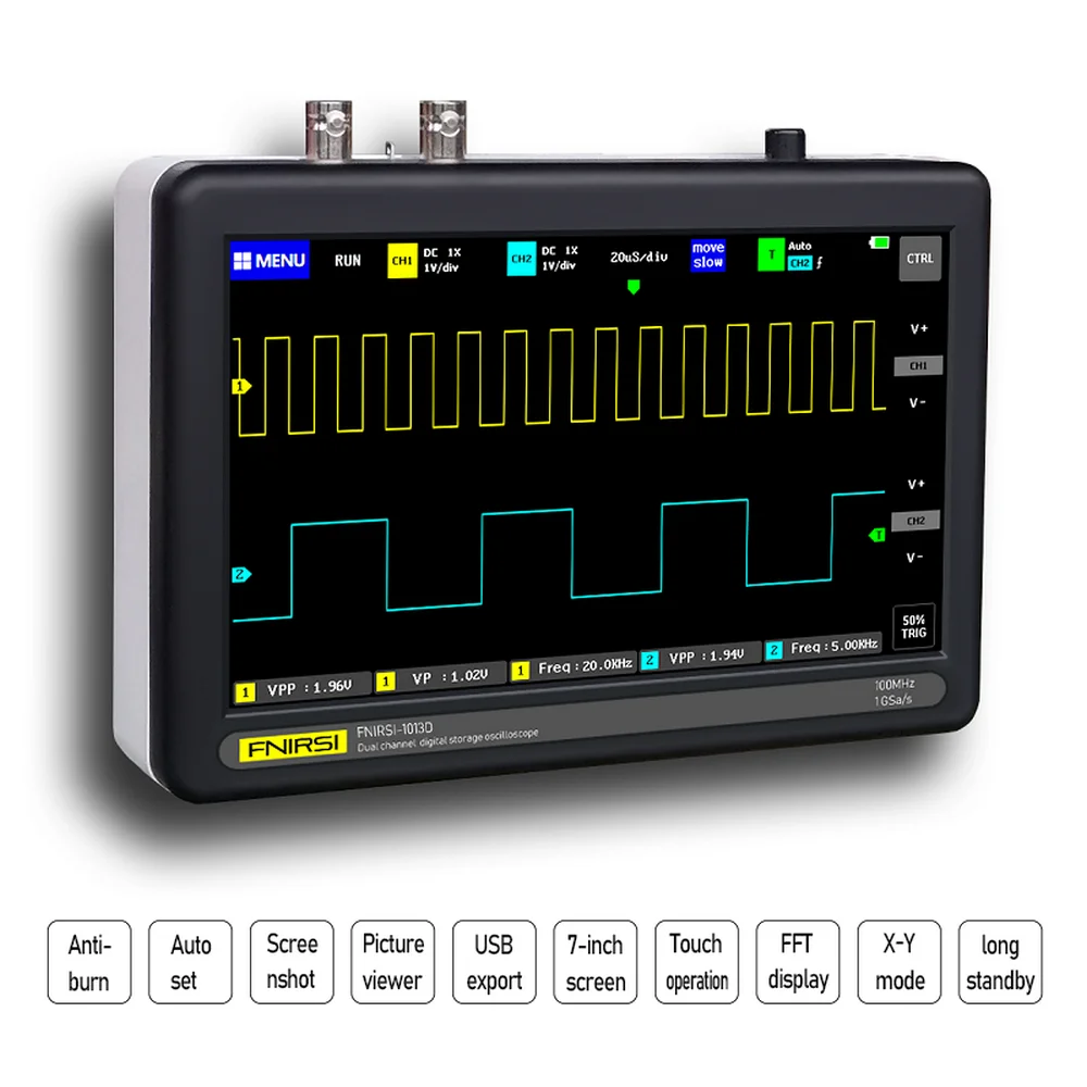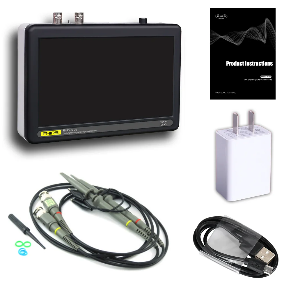 Особенности:Интеллектуальная защита от ожогов, 1X Выдерживает напряжение до 400 В.100 МГц аналоговая полоса пропускания @ 1GSa/s частота дискретизации (1X = 5 МГц, 10X = 100 МГц).Полностью подходит для 7 дюймов 800*480 цветной TFT ЖК-дисплей с яркими цветами и высокой контрастностью.Емкостный сенсорный экран, такой же, как и Сенсорный режим современного мобильного планшета, не является резистивным сенсорным экраном с древней операцией ногтей.Диапазон высокого напряжения, 1x может измерить 0 ~ 40 В, 10x может измерить 0 ~ 400 В, 100x может измерить 0 ~ 4000 в.До 12 параметров измерения: VPP, VP, Vmax, Vmin, Vavg, Vrms, частые, Duty +, Duty-, Time +, Time-, Period.Функция измерения курсора, удобно вручную измерять период, частоту и напряжение.Полная функция запуска (одиночная, нормальная, автоматическая).В любое время дисплей формы волны (Функция паузы) заморожен.Оснащен высокой эффективностью одной кнопкой авто.Одна кнопка хранения сигналов и скриншот.Встроенная память объемом 1 ГБ позволяет хранить до 1000 скриншотов + 1000 наборов данных волноводной формы.Мощный Графический менеджер поддерживает просмотр эскизов, просмотр, Детальный просмотр, поворот страницы, удаление и масштабирование формы волны, масштабирование, перемещение и т. Д.Оснащен интерфейсом USB, который может быть подключен к компьютеру, чтобы поделиться скриншотами с компьютером, что удобно для вторичного анализа.Функция графического дисплея Lissajous может использоваться для определения амплитуды, частоты и фазового контраста двух групп сигналов.Функция отображения FFT, может анализировать Спектральные характеристики сигнала.Встроенный перезаряжаемый литиевый аккумулятор емкостью 6000 мАч, полностью заряжен в течение 4 часов непрерывного использования при максимальной яркости экрана.Технология памяти, экран обновления сигнала не мерцает.Регулировка яркости экрана.Регулировка яркости фона.Ультратонкий, легко носить с собой.Характеристики:Материал: АБС-пластикЦвет: черный + белыйШирина аналогового ремешка: 100 МГц * 2Количество каналов: 2 каналаМаксимальная частота дискретизации в реальном времени: 1GSa/sВертикальная чувствительность: 50 мВ/див ~ 500 В/ДивГоризонтальный диапазон времени: 50S/div ~ 10NS/divМаксимальное тестовое напряжение: 40 В (1X зонд), 400 В (10X зонд)Глубина хранения: 240 кбитВходное сопротивление: 1 мТочность АЦП: 8 битРежим соединения: AC/DCРежим запуска: одиночный, нормальный, автоматическийКромка триггера: поднимающаяся кромка/опускающаяся кромкаНапряжение внешнего триггера: 0 ~ 40 вДисплей: 7 дюймов-800*480Работа: емкостный сенсорный экран + жестыУдлинительные порты: экспорт изображений USBИсточник питания: 1 * литиевая батарея, 6000 мАч (в комплекте)Размер изделия: 184*124*50 мм/7,2*4,9 * 2.0inРазмер посылка: 230*150*60 мм/9,1*5,9 * 2.4inПосылка Вес: 1000g / 2.2lbУпаковочный лист:1 * 1013D хост осциллографа2 * соответствующий зонд 100 МГц (1X и 10X)1 * usb-кабель для передачи данных1 * Руководство пользователя (на английском языке)