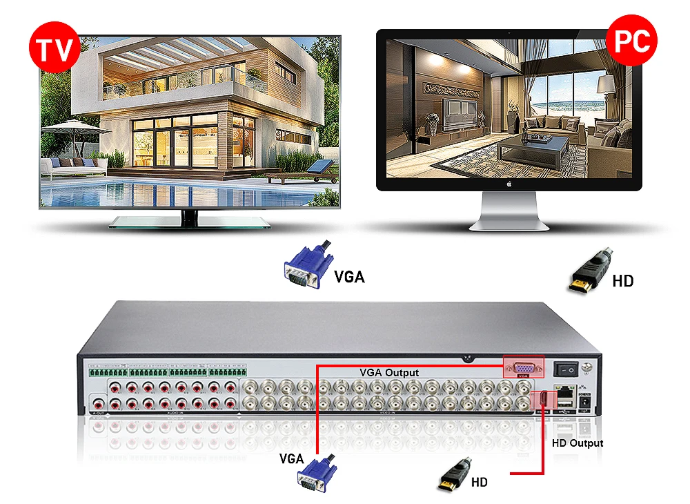 Просмотр на мониторе HDMl легко отображает видео через порт HDMI вашего монитора компьютера, чтобы в полной мере воспользоваться ясностью системы безопасности. (кабель HD не входит в комплект)Просмотр на телевизоре или мониторе ПК для дополнительного удобства, видеорегистратор также поставляется с подключениями VGA и BNC для стандартных вариантов просмотра разрешения.(Кабель VGA или BNC к RCA не входит в комплект.)