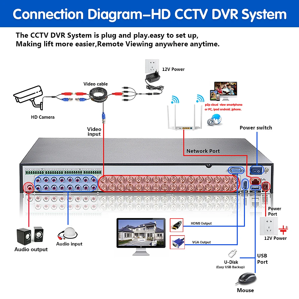 Простая настройка, всего 4 шага для просмотра мобильный телефон, просмотра видео в режиме реального времени из любого места и в любое время с помощью смартфона, стола или ПК с передовой технологией P2P, вы можете получить удаленный доступ к вашей системе за считанные минуты или меньше, нет необходимости в переадресации, удаленный доступ никогда не был таким простым!