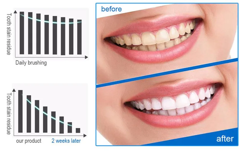 3. Отбеливание зубов полоски:Полоски для отбеливания зубов без перекиси воздействуют как на глубину, так и на поверхность, поэтому это эффективное средство для удаления пятен. Наши отбеливающие полоски обеспечивают эффективное домашнее отбеливание зубов, чтобы удалить эффекты курения, кофе, красного вина и пятен чая.