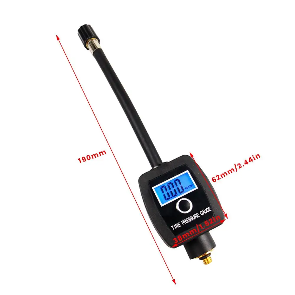 Название: цифровой манометр для шинМатериал: пластикЦвет: черныйВес: около 60 гРазмер (прибл.):Основной блок: 62*38,5*26 мм/2,44*1,52 * 1.02inОбщая длина: около 190 мм/7,48 дюймаБатарея: батарея с кнопкой 2030Режим отображения: ЦифровойДиапазон измерения: менее 150 фунтов на кв. дюйм/10 бар/1000 кПа/10 кг/см2