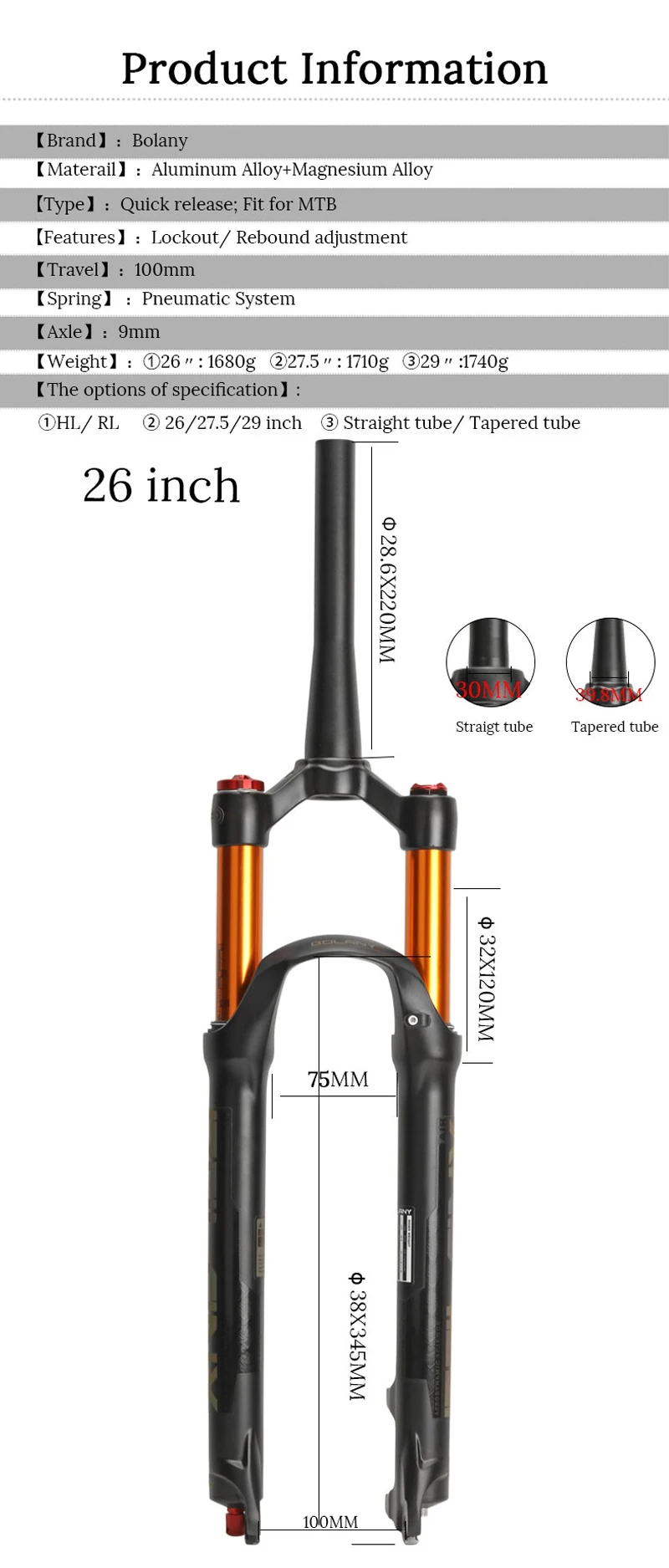 Название: вилка пневматической подвескиБренд: BOLANYРазмер: 26 дюймов, 27,5 дюймов, 29 дюймовВид: Lookout (LO) /Дистанционное устройство блокировки (RL)Путешествия: 100 мм (120 мм относится к наружному ходу и 100 мм является фактическим активным ходом)Ось: 9 ммКорона: кованый сплавТормоз: дисковый тормозСтойки: алюминий 32 ммС регулировкой амортизации (+ -)Гарантия: 1 годВес:26 В комплекте: 1670 г ~ 1720 г +/-50 г (только для справки)27,5 дюймов: 1690g ~ 1810g +/-50 г (только для справки)29 дюймов: 1740 г ~ 1820 +/-50 г (только для справки)Применимо: дорожный велосипед MTBВарианты: прямая трубка/коническая трубка, ручное управление/дистанционное управление