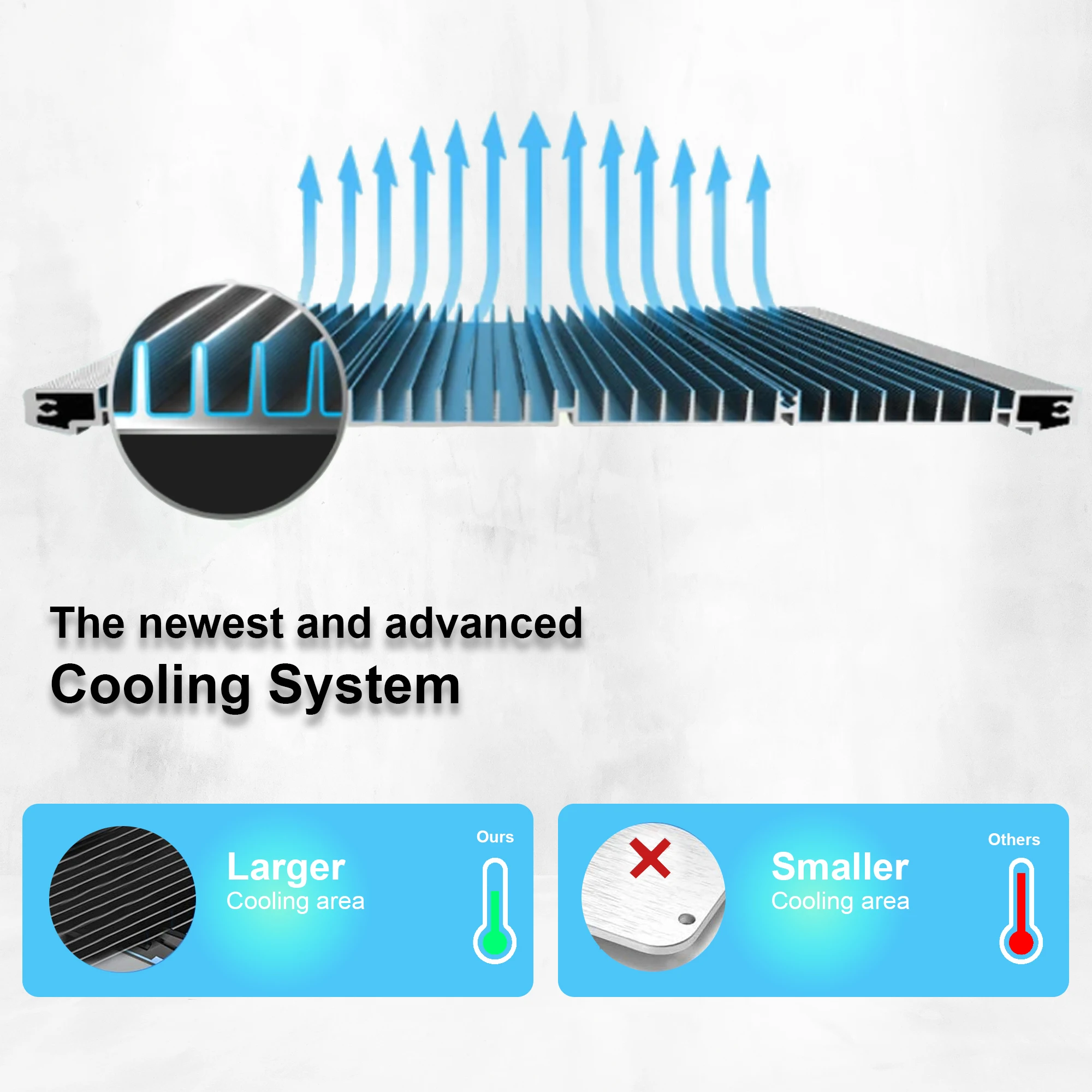 Высокая эффективность SAMSUNG LM301B до 230 лм/Вт, питание от драйвера серии Mean Well HLG, обеспечивает минимальную потерю мощности и длительный срок службы. Для лучшего рассеивания тепла мы используем радиатор толщиной 3 мм из алюминия. Отверстия на алюминиевой пластине и стекле делают тепловую конвекцию, пробегают 50 ~ 60 ℉ ниже, чем любые другие светодиоды