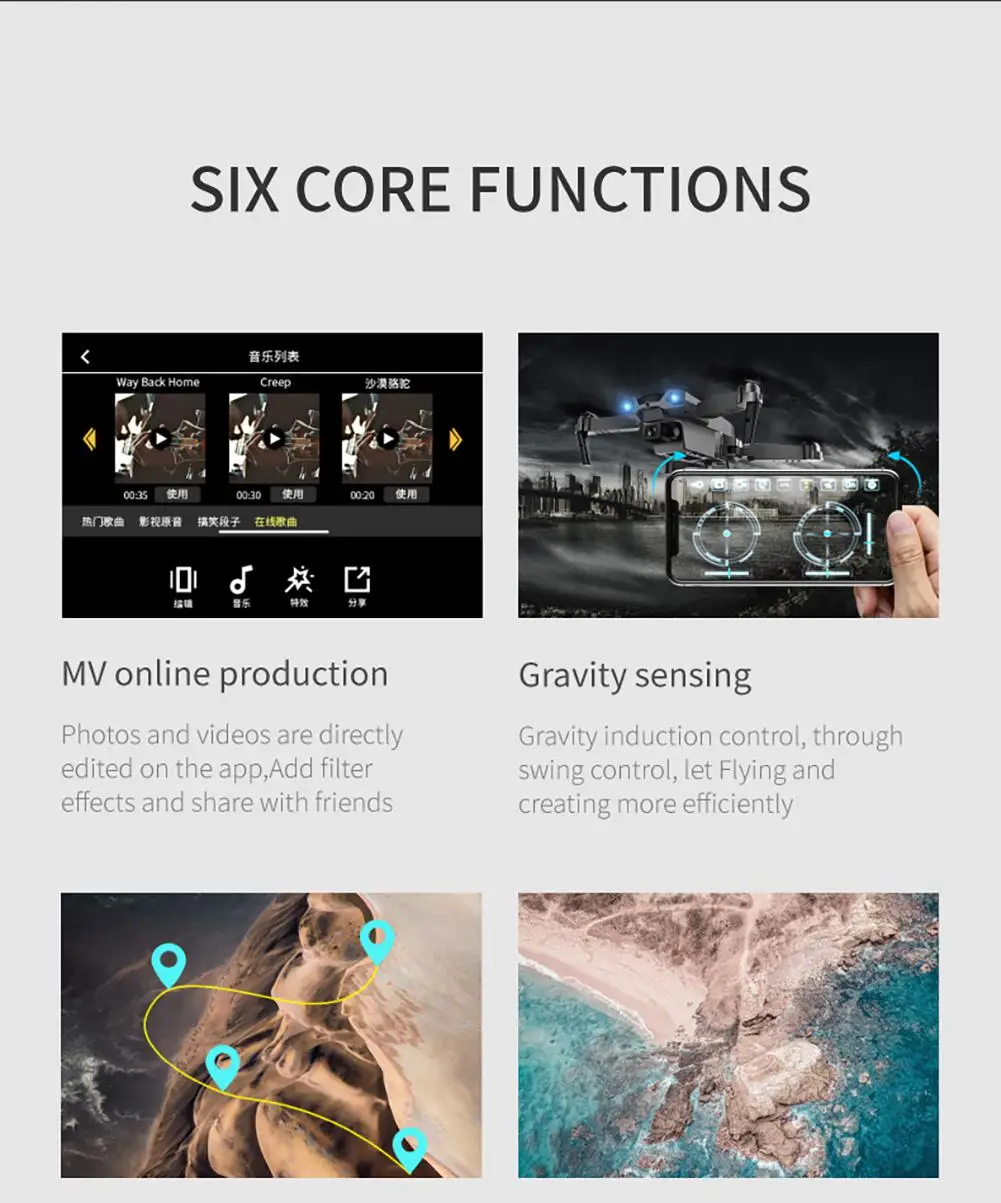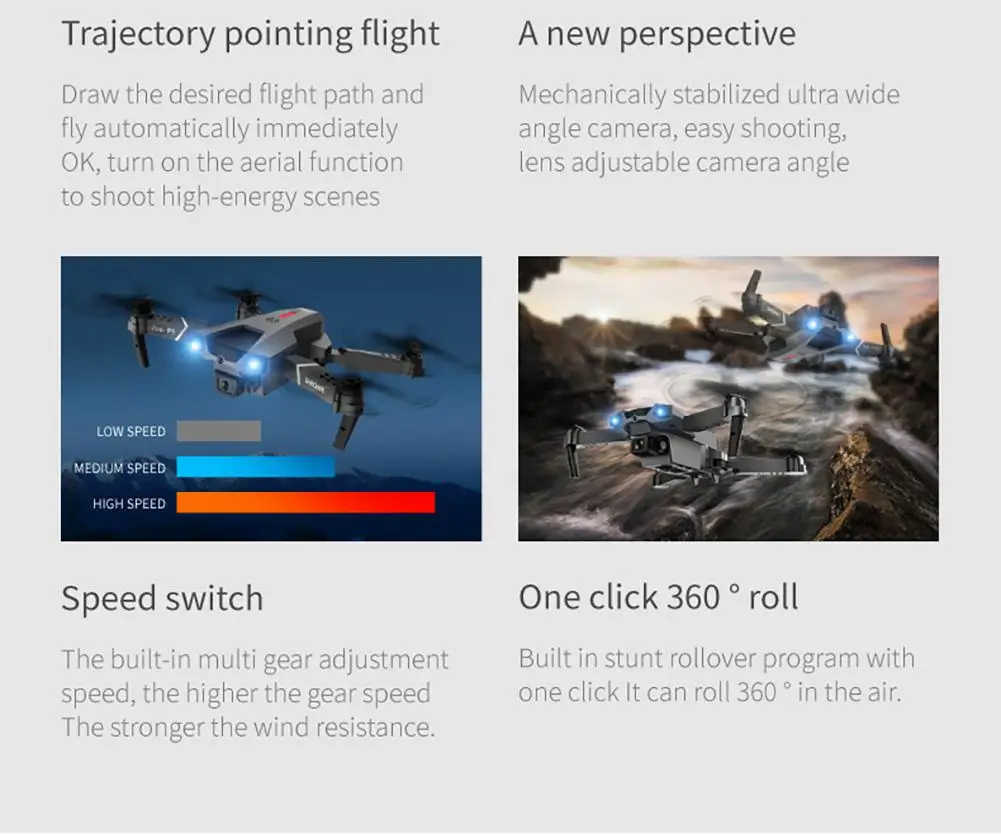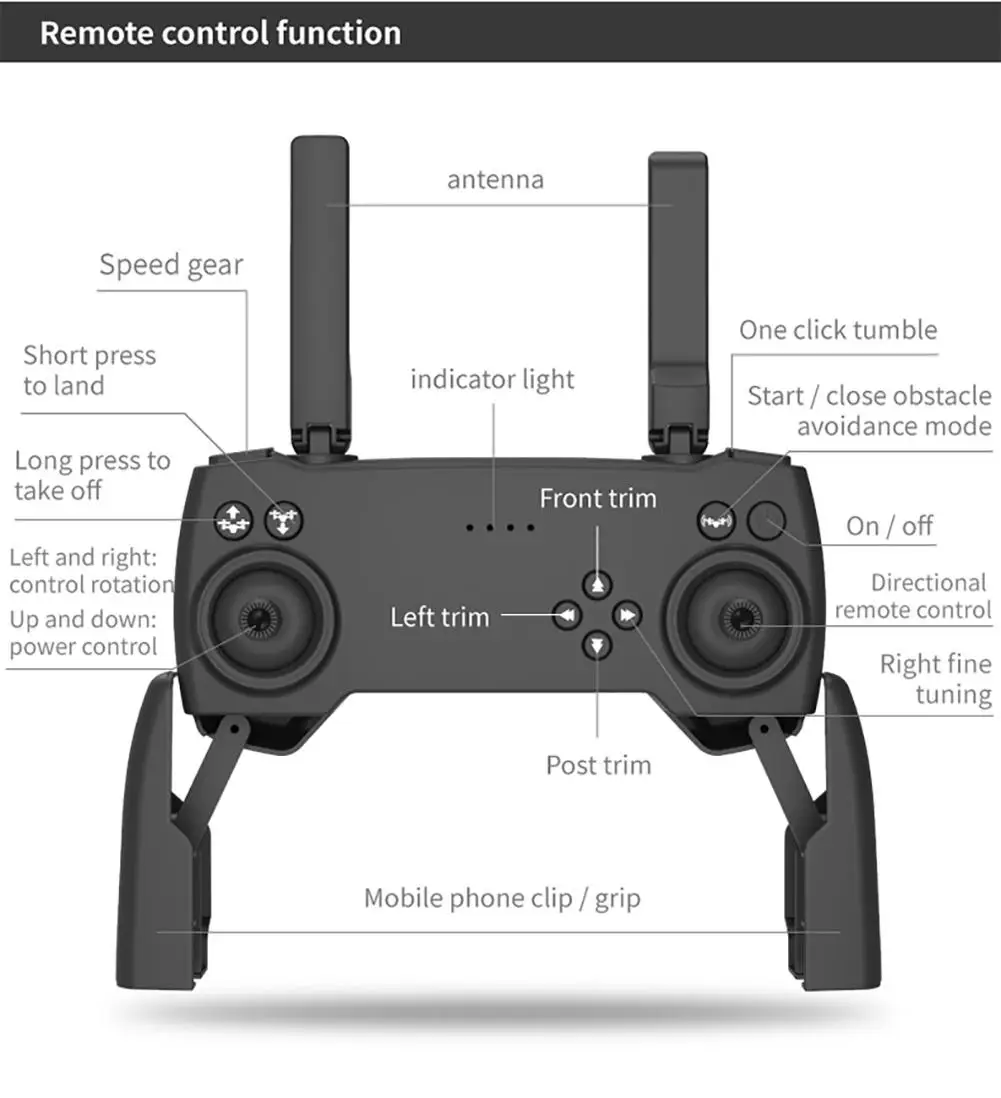 Функция: интеллектуальная функция избегания, функция фиксированной высоты, функция оптического позиционирования потока, складной самолет, шестисторонний гироскоп; Одно-кнопочное снятие, посадка одной кнопкой, подъем, вперед и Назад, левый и правый полет, поворот, Безголовый режим, фото жестов, видео, Безголовый режим, Аварийная остановка, траектория полета, датчик гравитации, автоматическая камера