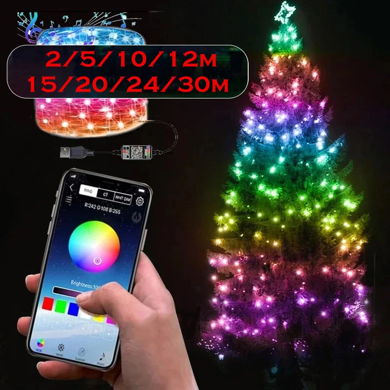 Новогодняя светодиодная гирлянда, 2-30 м, Bluetooth, управление чер...