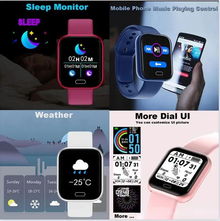 ОписаниеКатегории наручных часов: мужские или мужскиеСтиль наручных часов: Модный Функция наручных часов 1. Поддержка Bluetooth 4,0, Android , IOS2. Коснитесь экрана, чтобы контролировать наручные часы3. Шаги, калории, расстояние: при упражнениях он может записывать количество шагов, сожженные калории, траекторию бега и расстояние до места назначения.4. Монитор сердечного ритма: он будет точно контролировать и записывать ваш пульс.5. Монитор артериального давления: он будет точно контролировать и записывать ваше кровяное давление.6. Монитор сна: во время сна, он может контролировать время и качество сна.7. Напоминание о сидячем положении: Установите время напоминания о сидячем положении, оно будет вибрировать, чтобы напомнить вам об отдыхе.8. Будильник, погода, Bluetooth управление музыкой9. Дистанционное управление фотографией: в пределах 10 метров, вы можете встряхнуть его, чтобы управлять телефоном, чтобы делать фотографии.10. Напоминание о сообщениях и звонках: когда телефон получает звонок или сообщение, он будет вибрировать, чтобы напомнить вам Размер и весДлина наручных часов: около 25 смНаручные часы Диаметр циферблата: около 4 смНаручных часов толщина циферблата: около 1,2 смШирина ремешка: около 2 смВес наручных часов: около 50-150 г ПосылкаНаручные часы X 1Руководство * 1Водонепроницаемая СпецификацияВы можете мыть руки и лицо при носке.Но это не поддерживает купание, плавание, дайвинг. Как выбрать или вернуться к программеНажмите на небольшой эллипс или круг на экране в течение 1 секунды = Выберите программуНажмите на небольшой эллипс или круг на экране в течение 3 секунд = введите или выполните программу