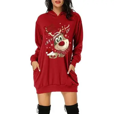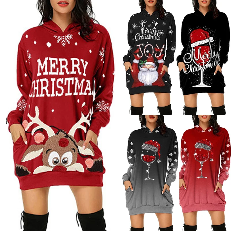 Рождественское платье, женское Повседневное платье-свитшот с длинным рукавом, женское платье, сексуальный вечерний пуловер с капюшоном, женские платья Вечерние