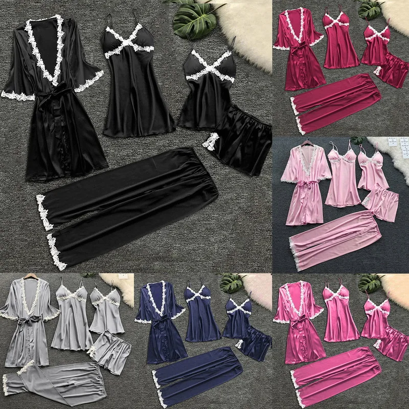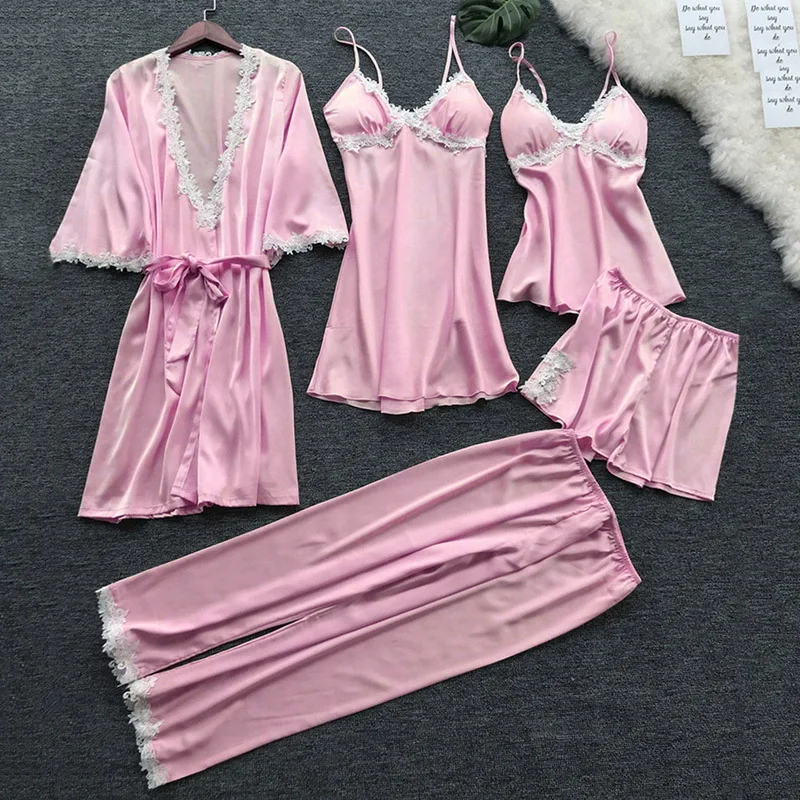 Пикантная ночная рубашка, пижама из пяти предметов, комплекты одежды для сна, шелковая пижама, костюм для сна, Женская кружевная атласная пижама, Пижамный костюм