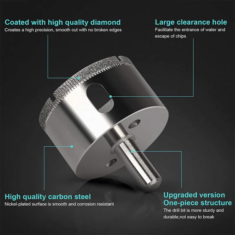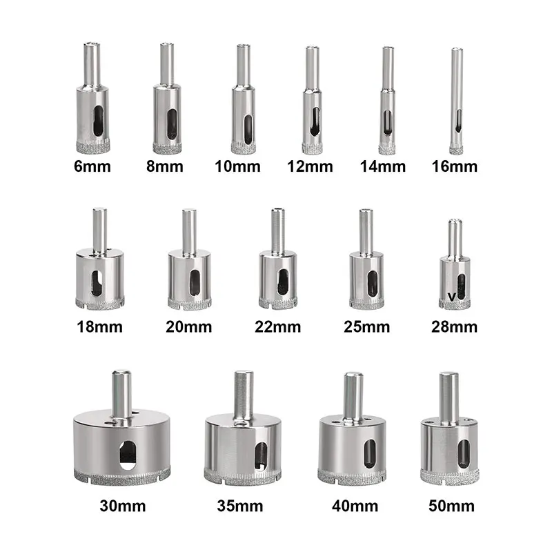 * 15 Размеров алмазная пила: 6 мм, 8 мм, 10 мм, 12 мм, 14 мм, 16 мм, 18 мм, 20 мм, 22 мм, 25 мм, 26 мм, 28 мм, 30 мм, 40 мм, 50 мм, изготовлены из высокопрочной углеродистой стали, интегрированная стальная структура делает эти алмазные сверла более прочными.