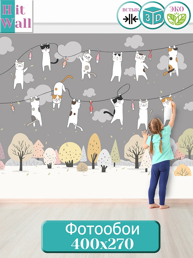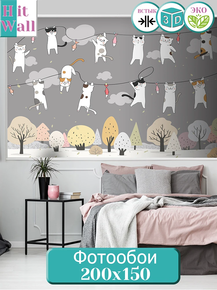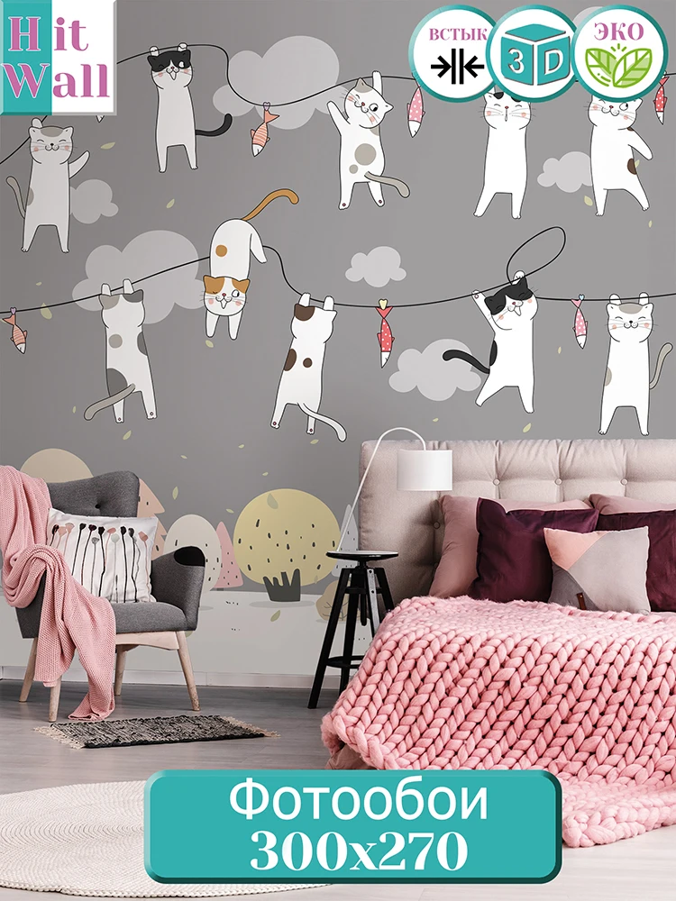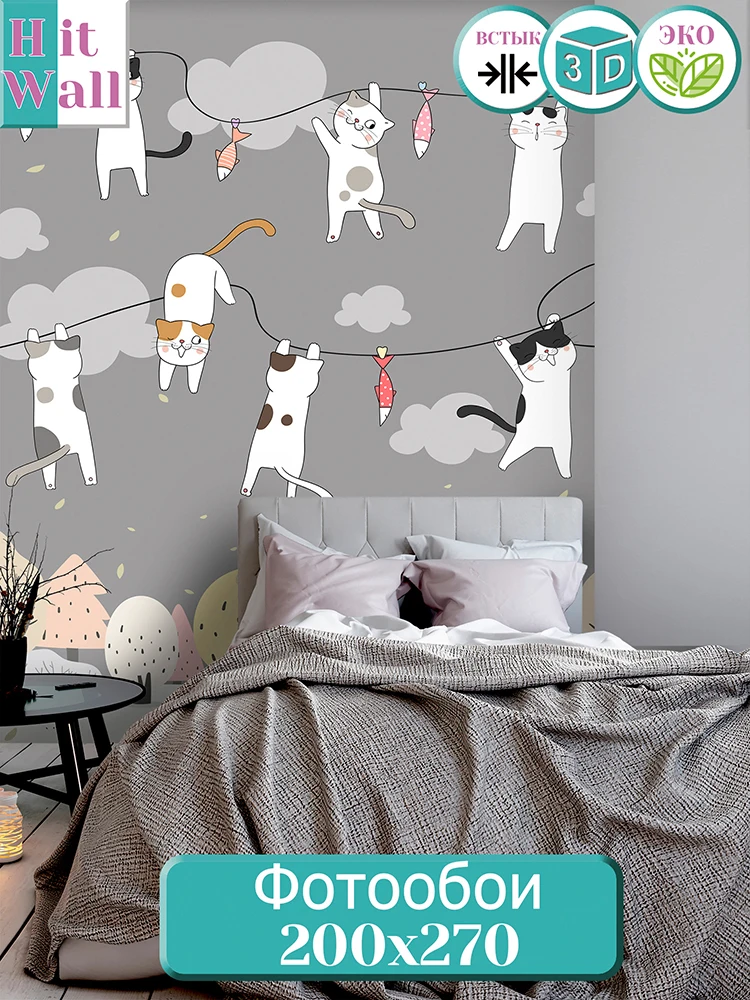 Фотообои Hit Wall 3D на стену флизелиновые детские котики на сером фоне для детской комнаты