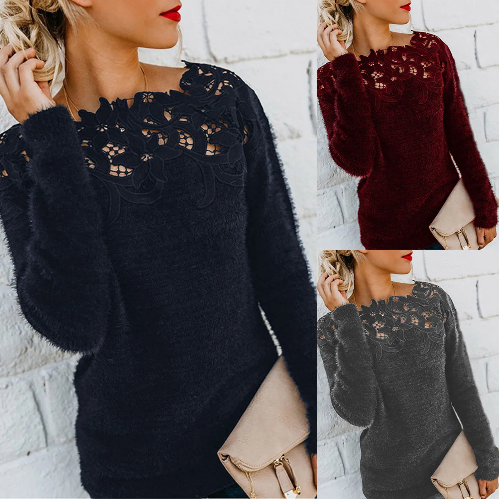 Женский Однотонный Свитер, привлекательный кружевной Свитер с длинным рукавом и открытыми плечами, Женский Свитер