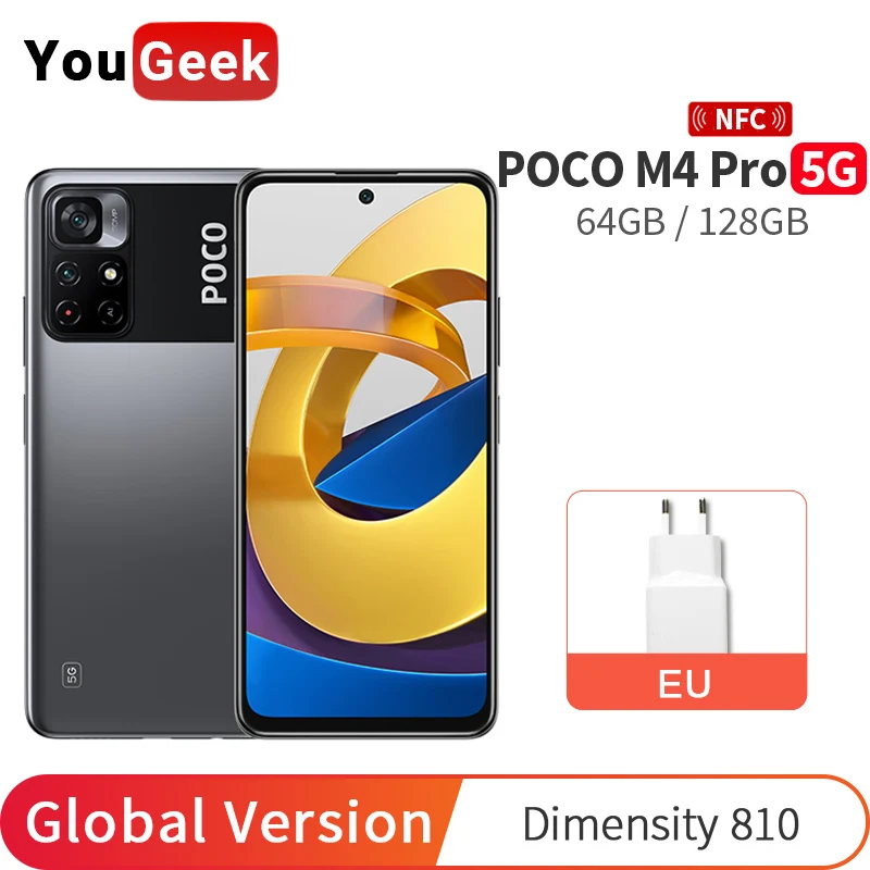 Глобальная версия POCO M4 Pro 5G с оригинальным зарядным устройством европейского стандарта> Процессор -------------- Dimensity 810 Octa Core Процессор, до 2,4 ГГц> Экран ---------- 6,6 дюймов 2400x1080P FHD + DotDisplay, частота обновления 90 Гц> RAM + ROM ----- 4 Гб + 64 Гб/6 ГБ + 128 ГБ> Камера -------- 50 Мп + 8 Мп задняя камера, 16 МП фронтальная камера> Батарея -------- 5000 мАч (Typ), поддержка быстрой зарядки 33 Вт pro>ОС ---------------- MIUI12.5, глобальная версия, поддержка многоязычных и Google Play> Другие ------------5G, NFC, Wi-Fi, Bluetooth 5,1, GPS, идентификация отпечатков пальцев, AI Face Unlock, 3,5 мм разъем для наушников, IR Blaster> Сеть ------ полная сеть, две sim-карты два режима ожидания