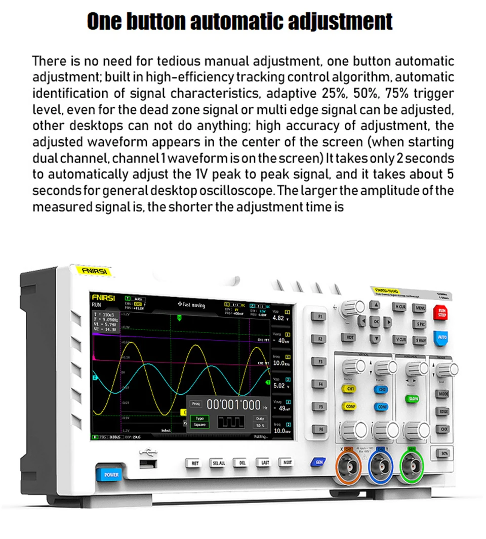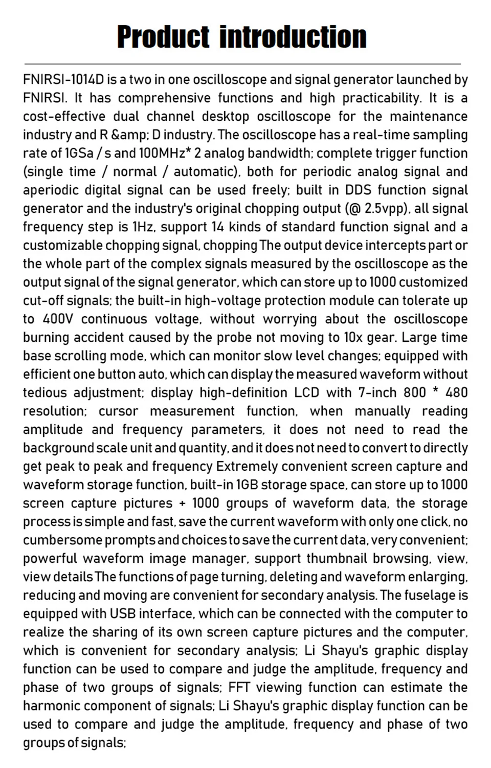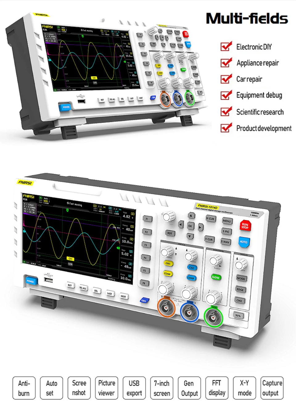 FNIRSI-1014D-это два в одном осциллографе и генератор сигналов, запущенный FNIRSI. Он имеет комплексные функции и высокую практичность. Это экономичный двухканальный Настольный осциллограф для индустрии технического обслуживания и НИОКР. Осциллограф имеет частоту дискретизации в реальном времени 1GSa / s и аналоговую пропускную способность 100 МГц * 2; Полная функция триггера (однократное/нормальное/автоматическое), как для периодического аналогового сигнала, так и для aperiodic цифрового сигнала может быть использован свободно; Встроенный генератор сигналов DDS и оригинальный выходной сигнал в отрасли (@ 2.5vpp), Все шаги частоты сигнала-1 Гц, поддержка 14 видов стандартного функционального сигнала и настраиваемого сигнала, измельчение выходного устройства захватывает часть или всю часть сложных сигналов, измеренных осциллографом как выходной сигнал генератора сигнала, который может хранить до 1000 индивидуальных сигналов отключения; Встроенный модуль защиты от высокого напряжения может выдерживать Непрерывное напряжение до 400 В, не беспокоясь о ДТП при сжигании осциллографа, вызванном тем, что датчик не перемещается на 10x шестерню. Большой режим горизонтальной прокрутки, который может контролировать медленные изменения уровня; Оснащен эффективной одной кнопкой авто, которая может отображать измеренную форму волны без утомительной регулировки; дисплей высокой четкости ЖК-дисплей с 7-дюймовым 800*480 разрешение; Курсором благодаря функции измерения, при ручном чтения амплитуду и частоту параметры, Не нужно считывать фоновые весы и количество, и не нужно конвертировать, чтобы напрямую Получить пик до пика и частоты, чрезвычайно удобная функция захвата экрана и хранения сигналов, встроенная память объемом 1 Гб, может хранить до 1000 фотографий с экрана + 1000 групп данных волноводной формы, Процесс хранения прост и быстр, сохранение текущей формы сигнала одним щелчком, отсутствие громоздких подсказок и выбор для сохранения текущей информации, очень удобный; Мощный менеджер изображений формы волны, поддержка просмотра эскизов, просмотр, просмотр подробной информации о функциях поворота страницы, удаления и увеличения формы волны, Уменьшение и перемещение удобны для вторичного анализа. Фюзеляж оснащен интерфейсом USB, который может быть подключен к компьютеру для реализации совместного использования собственных фотографий экрана и компьютера, что удобно для вторичного анализа; функция графического дисплея Li Shayu может использоваться для сравнения и определения амплитуды, частоты и фазы двух групп сигналов; Функция просмотра FFT может оценить гармонический компонент сигналов; Функция графического дисплея Li Shayu может использоваться для сравнения и определения амплитуды, частоты и фазы двух групп сигналов;