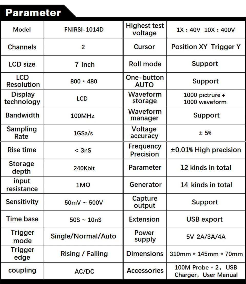 Характеристики:1: ширина аналогового ремешка: 100 МГц * 22: Количество каналов: 2 канала3: Максимальная частота дискретизации в реальном времени: 1GSa/s4: вертикальная чувствительность: 50 мВ/див ~ 500 В/Див5: Горизонтальный диапазон времени: 50S/div ~ 10NS/div6: Максимальное испытательное напряжение: 40 В (1X зонд), 400 В (10X зонд)7: Глубина хранения: 240 кбит8: Входное сопротивление: 1MΩ9:ADC точность: 8 бит10: Режим соединения: AC/DC11: режим запуска: одиночный, нормальный, автоматический12: кромка триггера: подъемная кромка/опускающаяся кромка13: внешнее триггерное напряжение 0 - 40 в14: Дисплей: 7 дюймов-800*48016: удлинительные порты: экспорт изображений USB18: Размер: 340 мм x 140 мм x 70 мм19: тела Вес: 1,5 кг