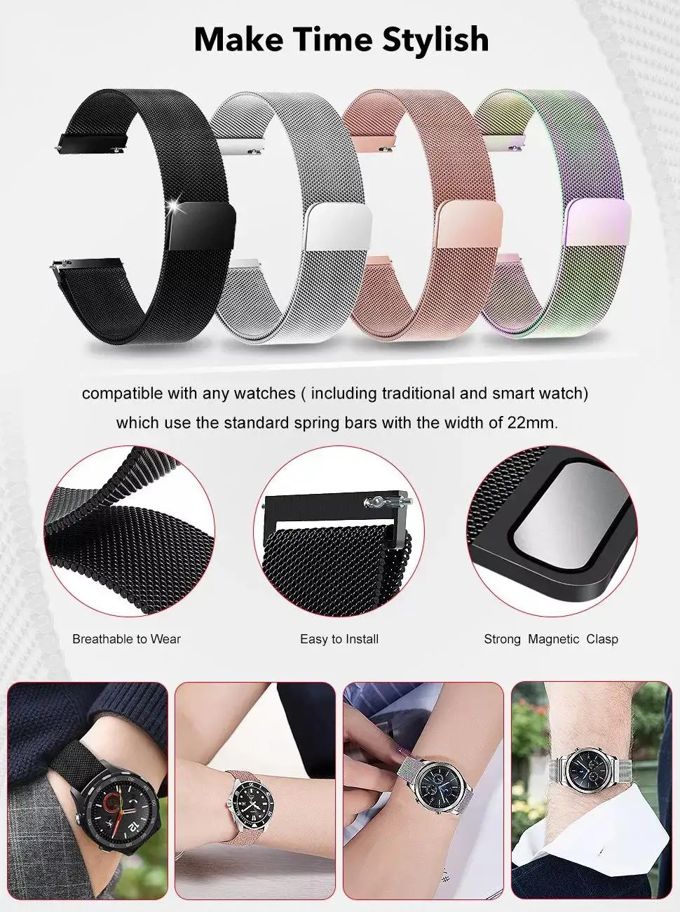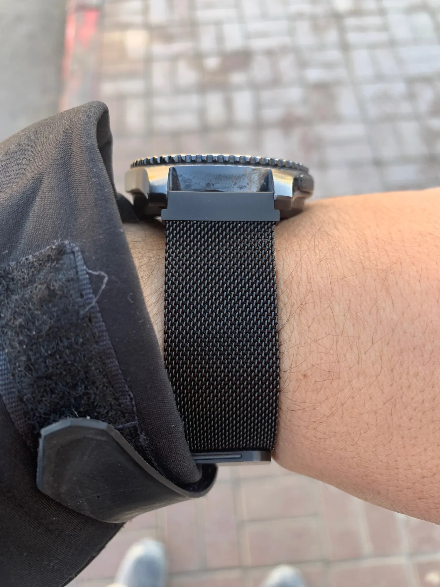 Он идеально подходит для часов huawei gt2. Это удобно и красиво. Тот же ремешок имеет магнит, защищенный и его легко укоротить или удлинить. Цвет элегантный и без дефектов во всем продукте. Я рекомендую это 100%
