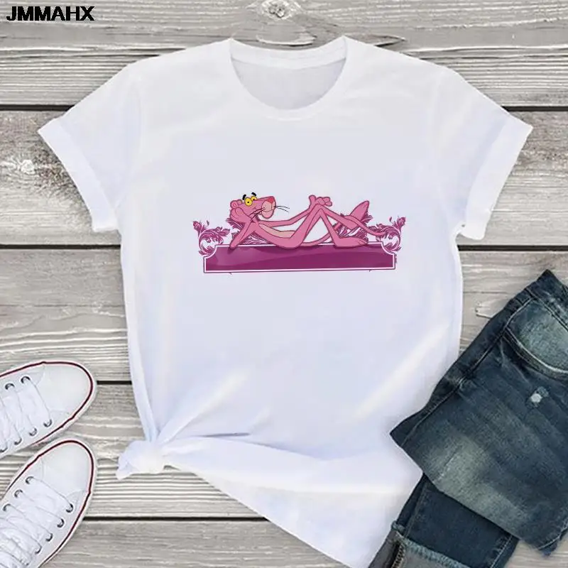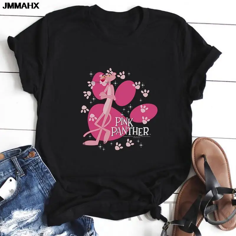 Модная женская футболка с принтом розовой Пантеры, женская одежда в стиле Харадзюку, футболка, Повседневная Уличная одежда с коротким рукавом, черный топ, женская футболка