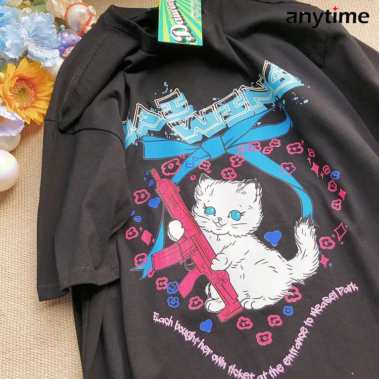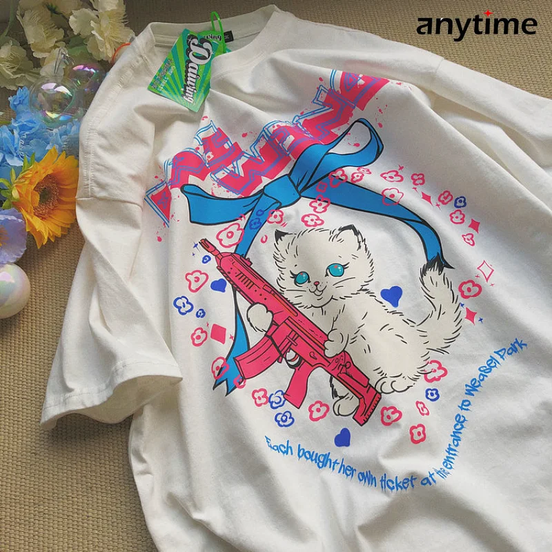 Футболка женская с принтом пистолета и котенка, милый Повседневный Топ в стиле японской уличной школы, свободная рубашка в стиле ольччан, в стиле ретро, в стиле Харадзюку, на лето