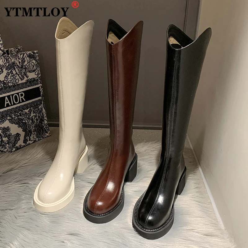 Женские кожаные сапоги до колена на платформе, осенне-зимние сапоги...
