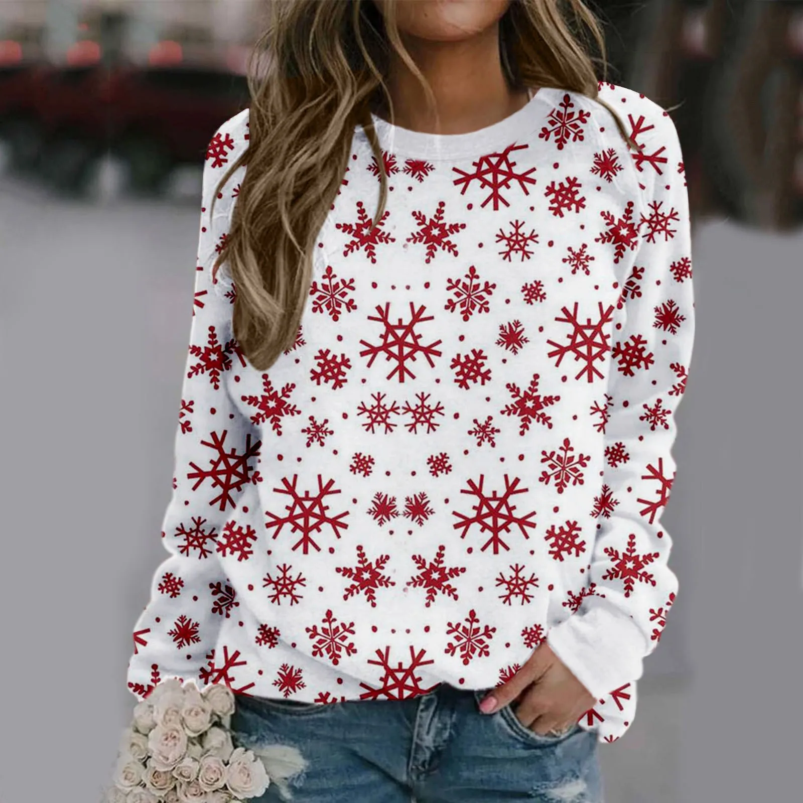 Модные женские вечерние топы с круглым вырезом и длинными рукавами с рождественским принтом