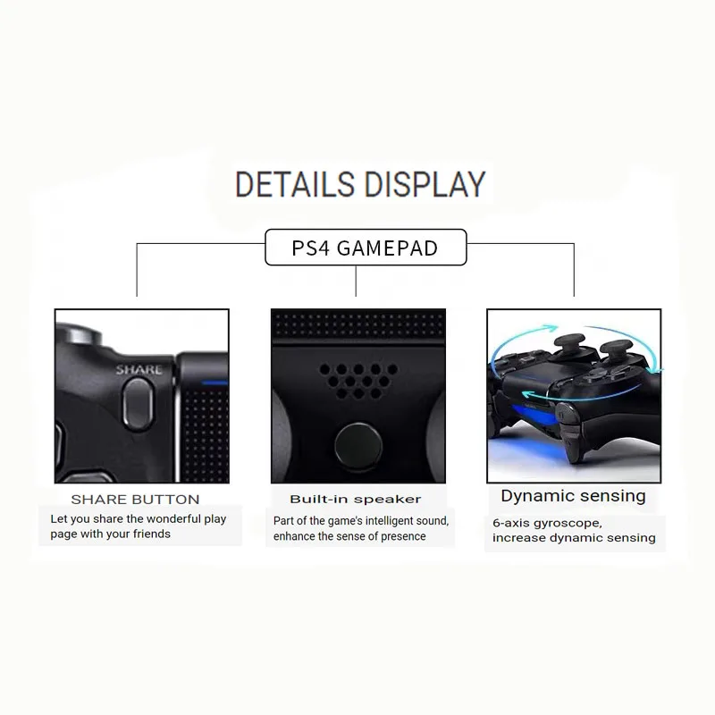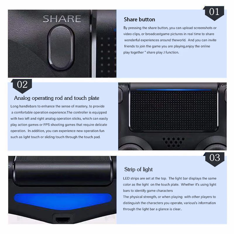 Продукт, функции, использование, Описание:<;br/>1. Полнофункциональный беспроводной контроллер Bluetooth PS4<;br/> 2,600 мАч позволяет вам наслаждаться игрой в течение длительного времени <;br/>3. Поддерживает обновления, и существует множество цветов на выбор от <;br/>4. Питание от адаптера зарядного устройства USB <;br/>5. Светодиодный индикатор показывает состояние зарядки <;br/>6. Никогда не беспокойтесь о разрядке аккумулятора <;br/>7. Все функции включают в себя: Сенсорная функция + динамик + разъем для наушников + двойной Электрический шок <;br/> Примечание: Это не оригинальный контроллер, это высококачественный контроллер PS4, произведенный в Китае. Его рабочее состояние совпадает с оригинальным контроллером.<;br/> как сочетаться при первом использовании:<;br/> Шаг 1. Используйте кабель для подключения консоли и контроллера.<;br/> Шаг 2. Нажмите кнопку Home в течение 3 секунд.<;br/> Шаг 3. Когда светодиодный светильник включен, отключите кабель для использования.<;br/> после этого вы можете нажать круглую кнопку, когда хотите подключиться.<;br/> шаги подключения Bluetooth <;br/> вы должны сначала удерживать кнопку SHARE контроллера PS4, затем нажмите кнопку «Домой» (маленькая круглая кнопка посередине). Помните, что не нажимайте кнопки «домой», чтобы сделать светильник бар светильник или похода по магазинам. Когда светильник выключен, сначала нажмите клавишу SHARE, а затем нажмите клавишу HOME одновременно.<;br/> примерно через 5 секунд, индикатор светильник на обратной стороне PS4 ручка начал мигать быстро, И затем две кнопки были выпущены одновременно.<;br/> затем выполните поиск устройства Bluetooth на устройстве, вы можете увидеть bluetooth-устройство с именем & quot; Беспроводной контроллер & quot;, и вы можете подключить его.<;br/> шаги подключения Bluetooth <;br/>1. В светильник не светильник или похода по магазинам.<;br/>2. Сначала нажмите клавишу SHARE.<;br/>3. Затем нажмите кнопку HOME одновременно.<;br/>4. До тех пор, пока светильник не начнет мигать быстро.<;br/> Примечание: когда светильник выключен, сначала нажмите кнопку share, затем нажмите кнопку home и удерживайте его около 5 секунд.<;br/> Упаковочный лист:<;br/>1 * беспроводной геймпад Bluetooth <;br/>1 * usb-кабель для зарядки
