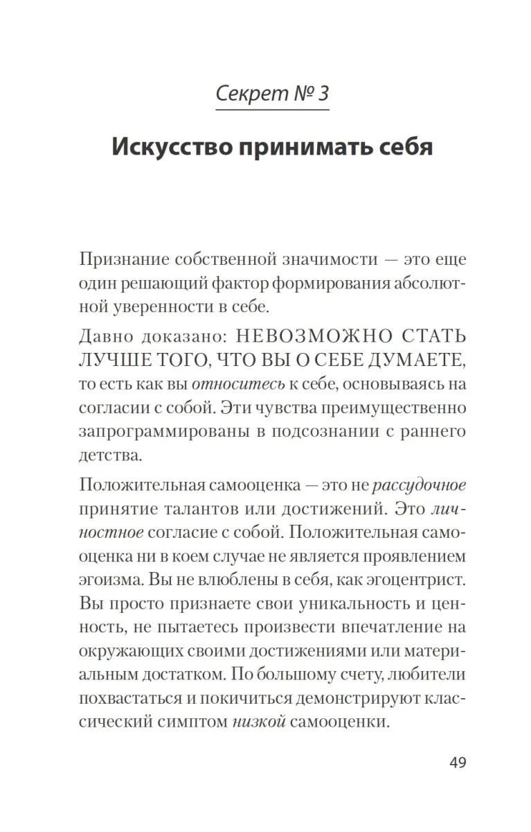 Как добиться абсолютной уверенности в себе? Те, кто советует вам воспитывать силу воли, правы, но они не так далеко продвинулись на пути к цели. Одного решения преуспевать и вести более плодотворный, творческий образ жизни недостаточно, ибо оно не затрагивает суть проблемы, которая заключается в ошибочном восприятии. Как только мы правильно оценим положение вещей и истолкуем свое окружение в истинном свете, мы сможем изменить себя. Только изменив себя, можно обрести стопроцентную уверенность в себе!