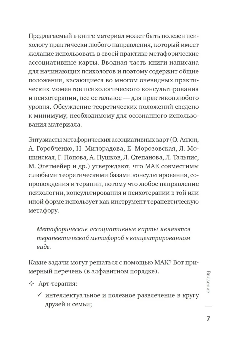 Книга вводит в волшебный мир метафорических ассоциативных карт – уникального инструмента для повседневной деятельности практического психолога, психотерапевта, коуча, педагога. В издании изложены принципы и практические советы по организации работы, выбору стимульного материала, подбору сценариев для группы и индивидуального консультирования.Приведенные в книге почти пятьдесят вариантов применения метафорических ассоциативных карт создают арсенал на все случаи жизни, более чем достаточный для начала работы, и демонстрируют принципы, на которых можно строить собственные игры. С учетом вариантов использования, прилагающихся к каждой колоде ее авторами, этого более чем достаточно.Книга будет полезна практическим психологам, педагогам, социальным педагогам, студентам и аспирантам педагогических и психологических специальностей.