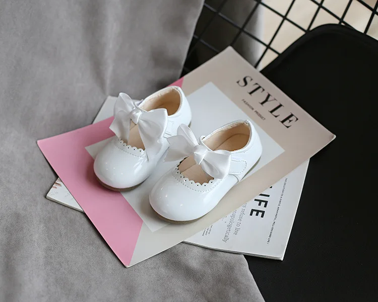 Кожаные туфли для девочек, мягкая лакированная кожа, плоская подошва, кружевной бант, жемчуг вечерние для дня рождения, свадьбы