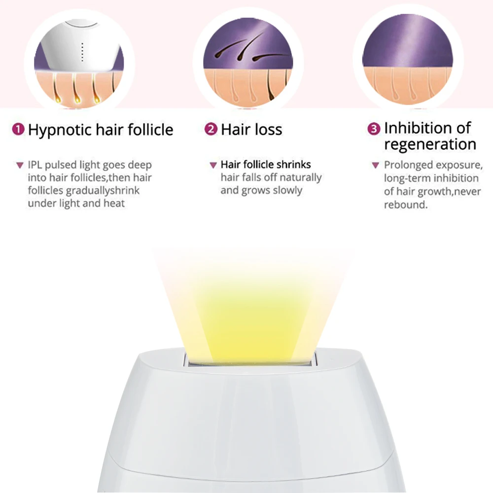 1. Используйте технологию IPL (интенсивный импульсный светильник) для эффективного и мгновенного удаления волос, достаточно мягко, чтобы избежать аллергии или боли на вашей коже, мощный и долговечный, чтобы мигать до 600000 раз.