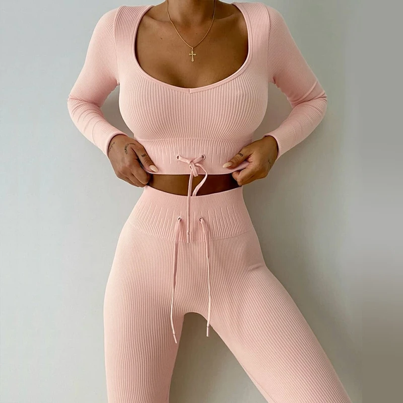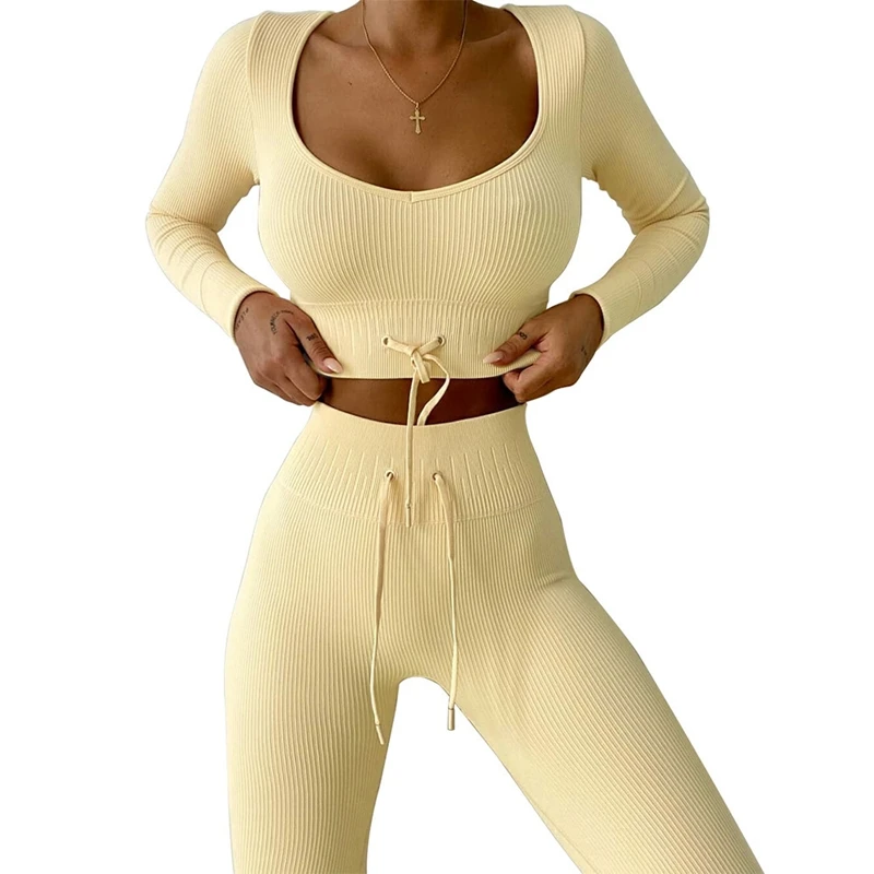 Женский комплект для йоги, бесшовный короткий топ с длинным рукавом, леггинсы с высокой талией, эластичная лента, спортивная одежда для фитнеса, костюмы для тренажерного зала, женский костюм